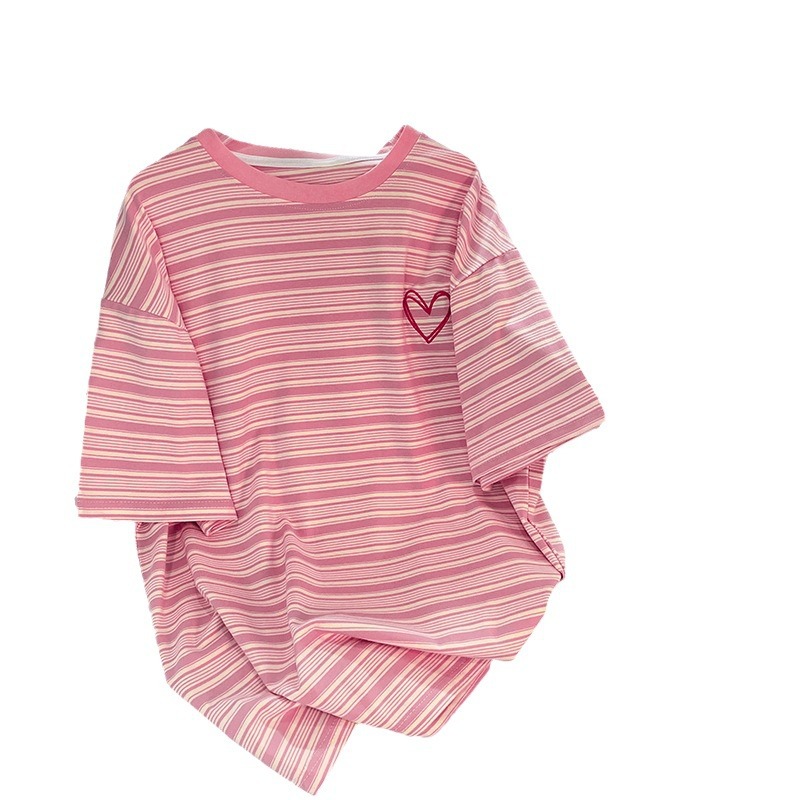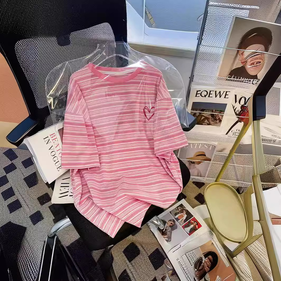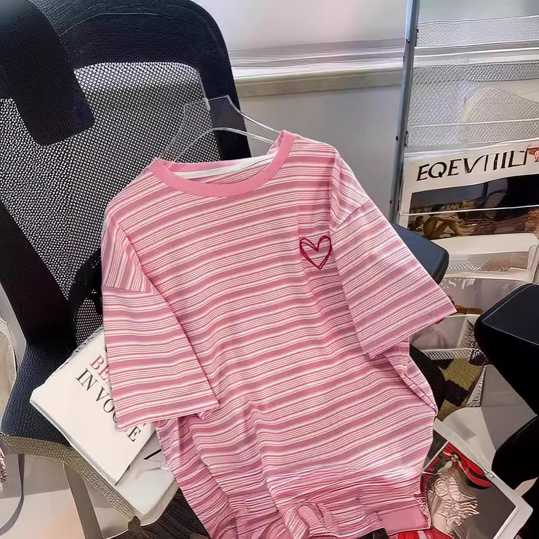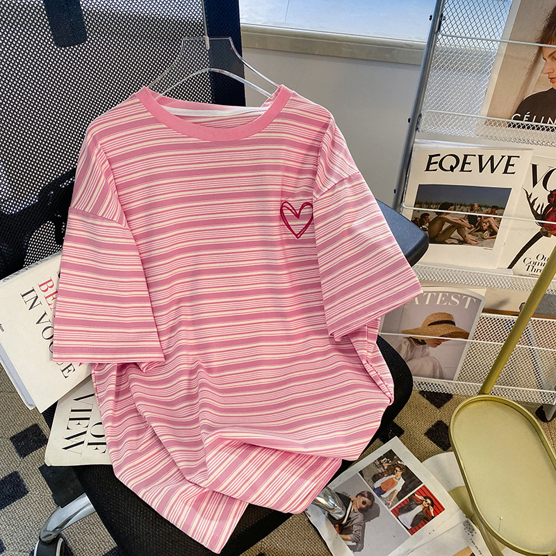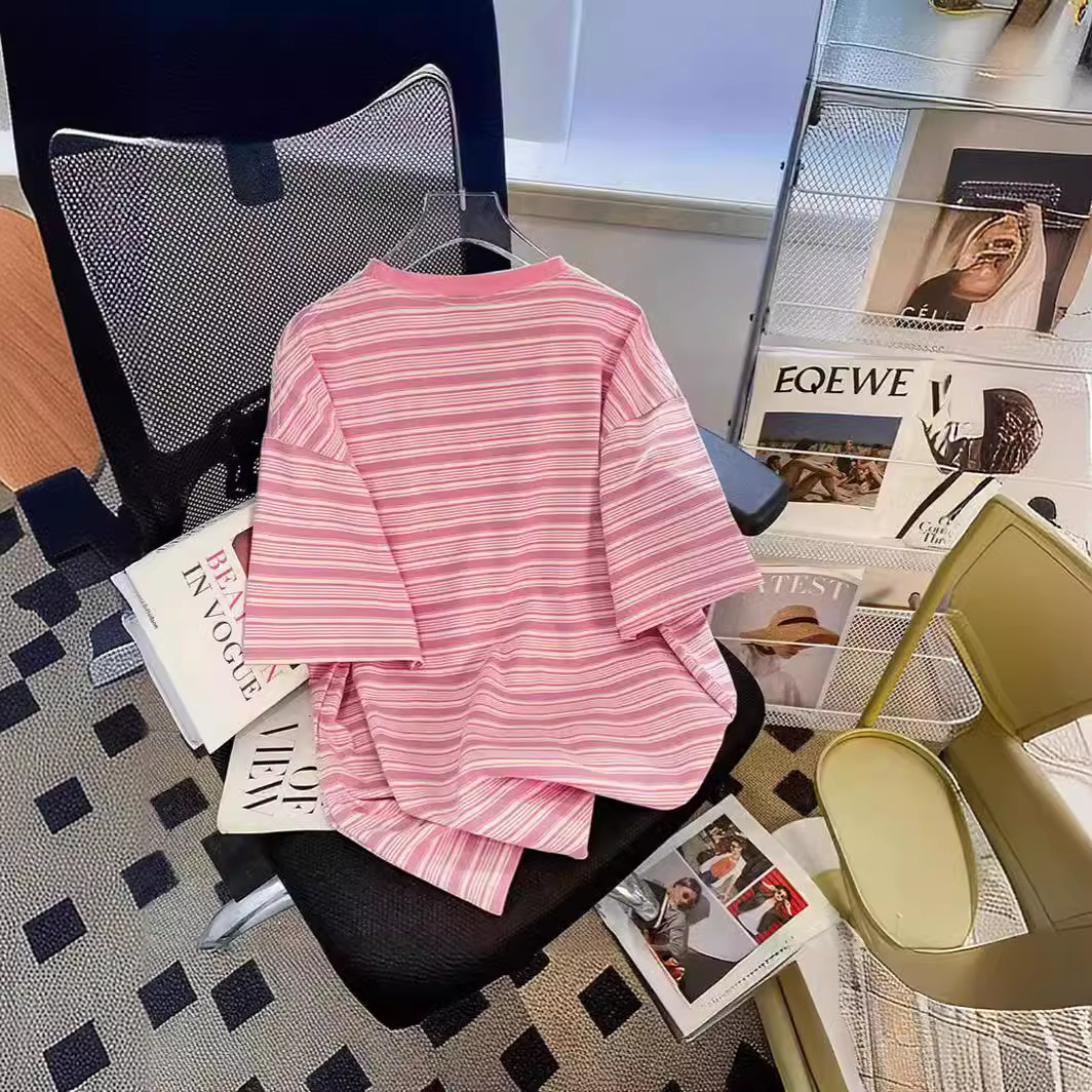 特大码300斤刺绣条纹半袖T恤显瘦时尚休闲设计感夏季半袖ins圆领