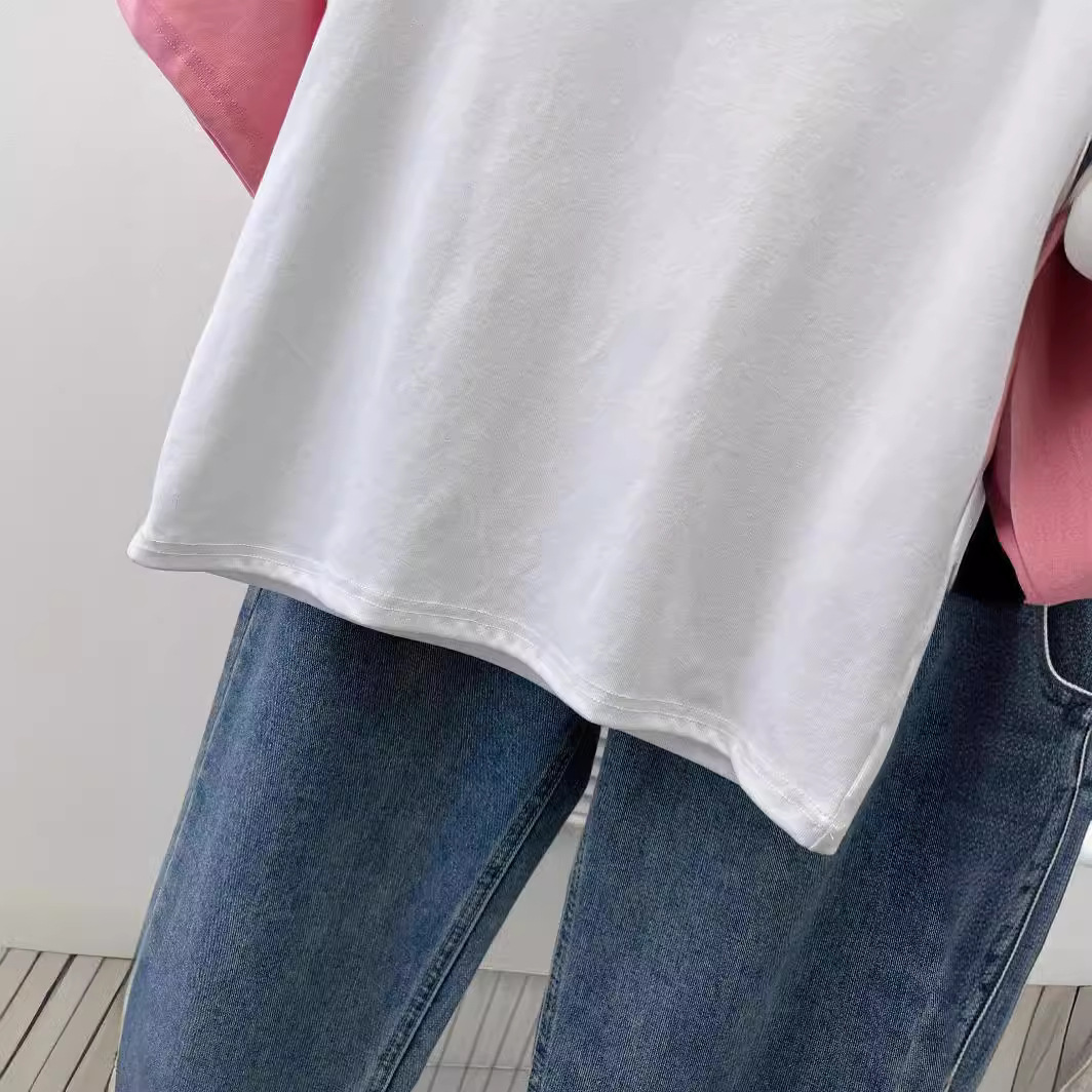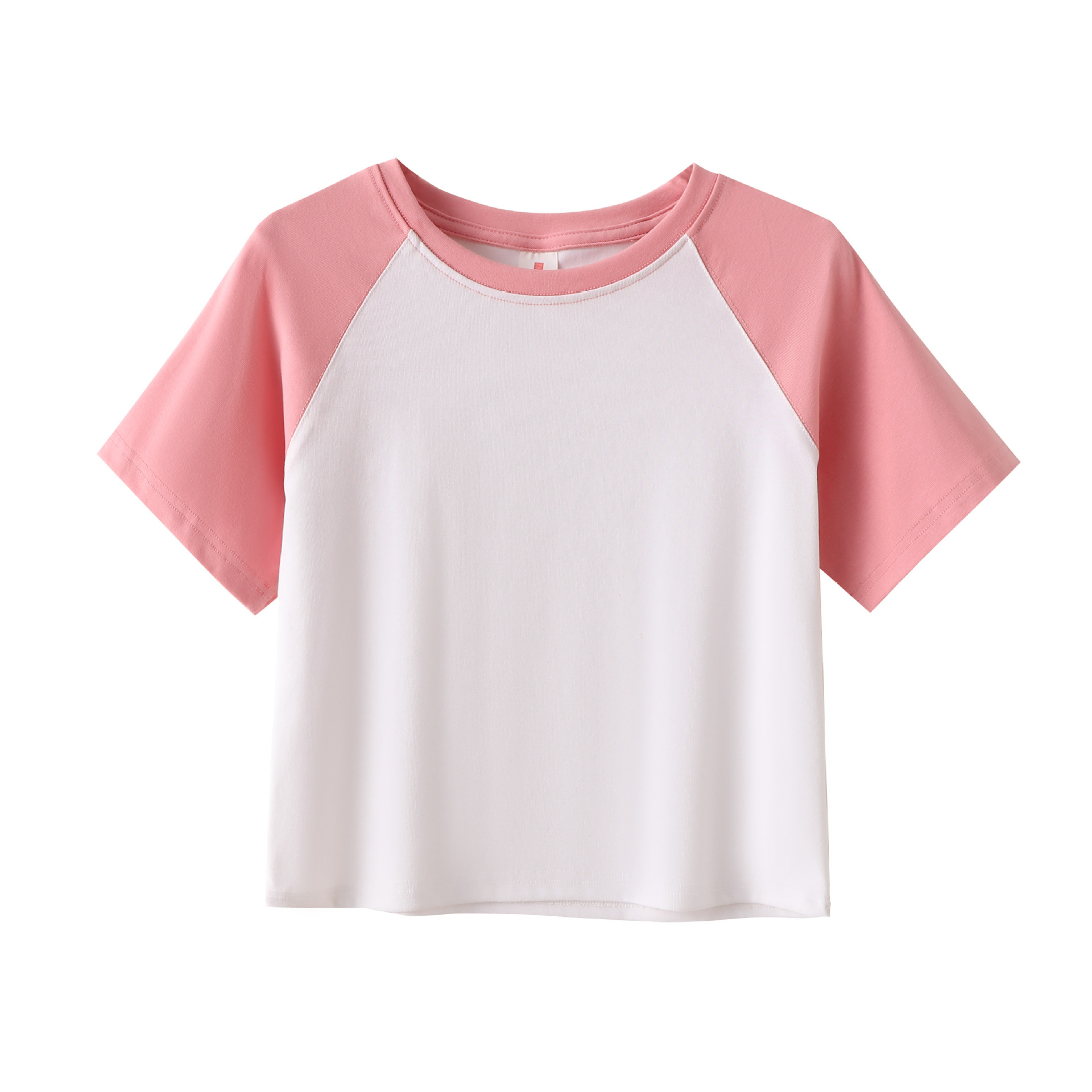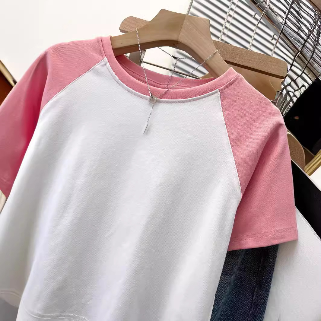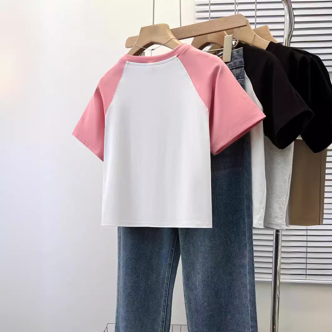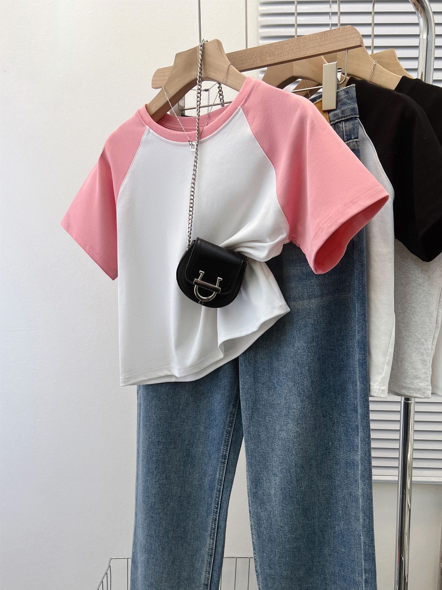 运动休闲夏季拼接撞色拼色t恤网红洋气时尚半袖宽松圆领插肩上衣