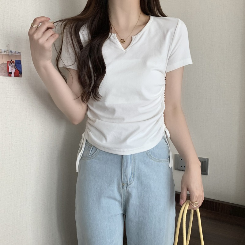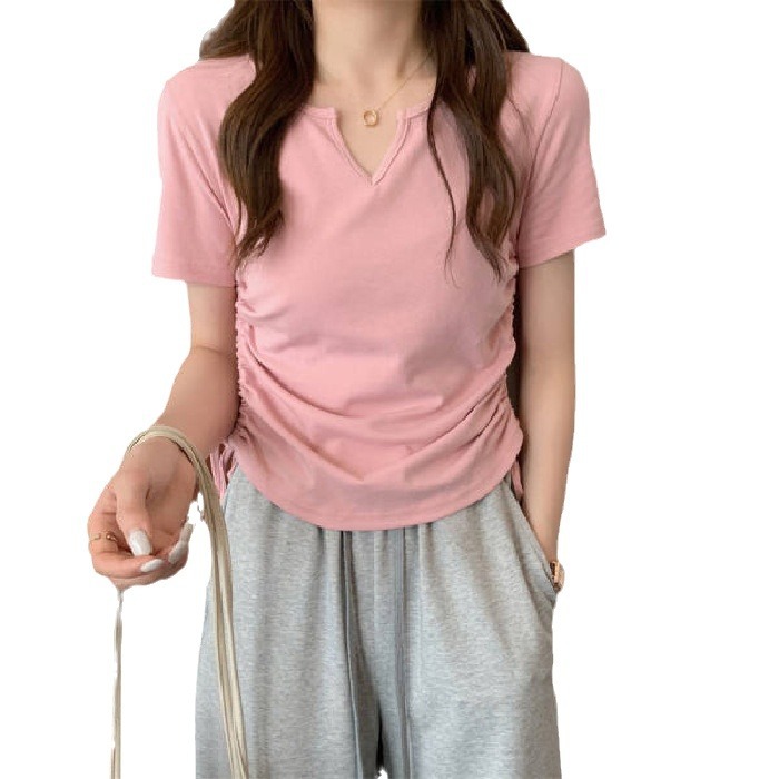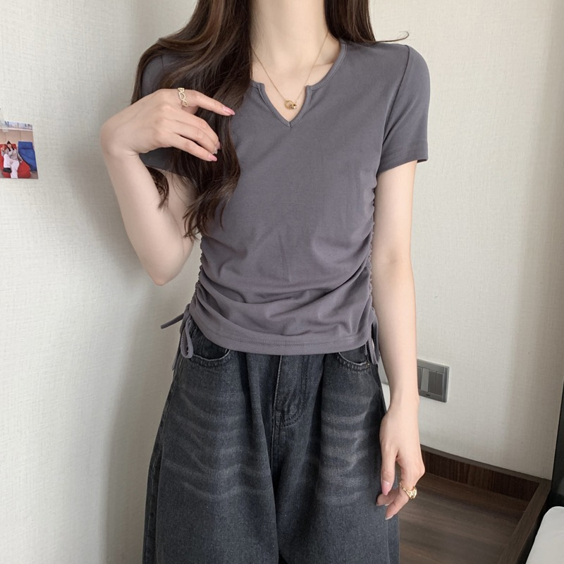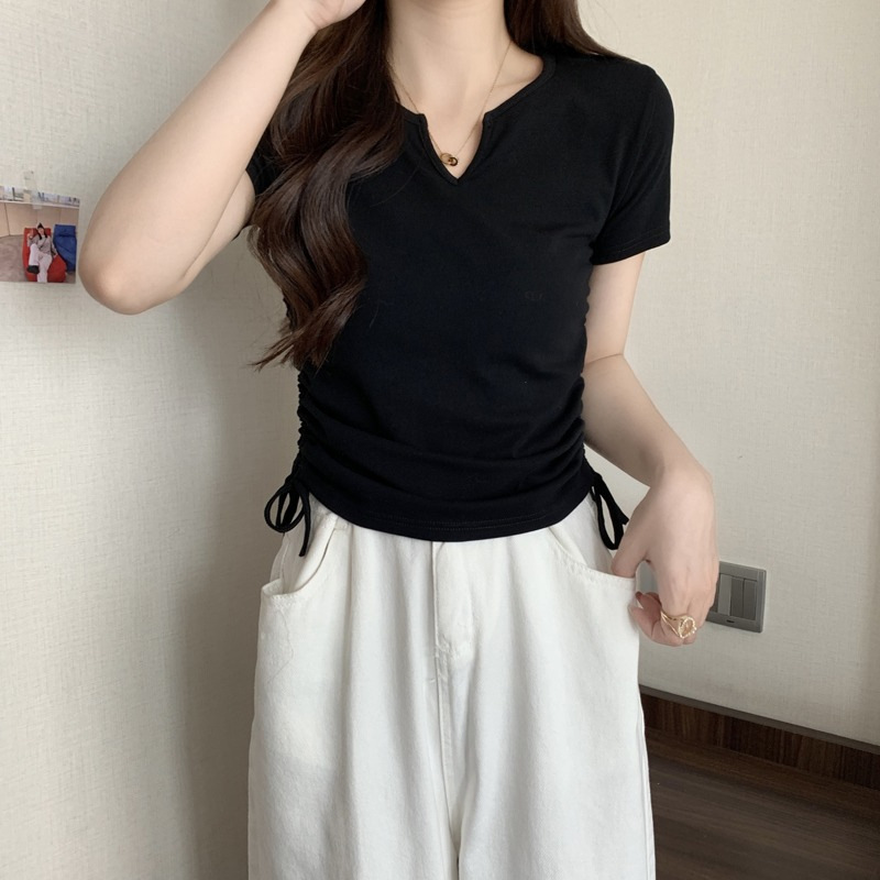 螺纹小众T恤打底衫女夏季新款抽绳辣妹纯色短袖开叉修身性感上衣