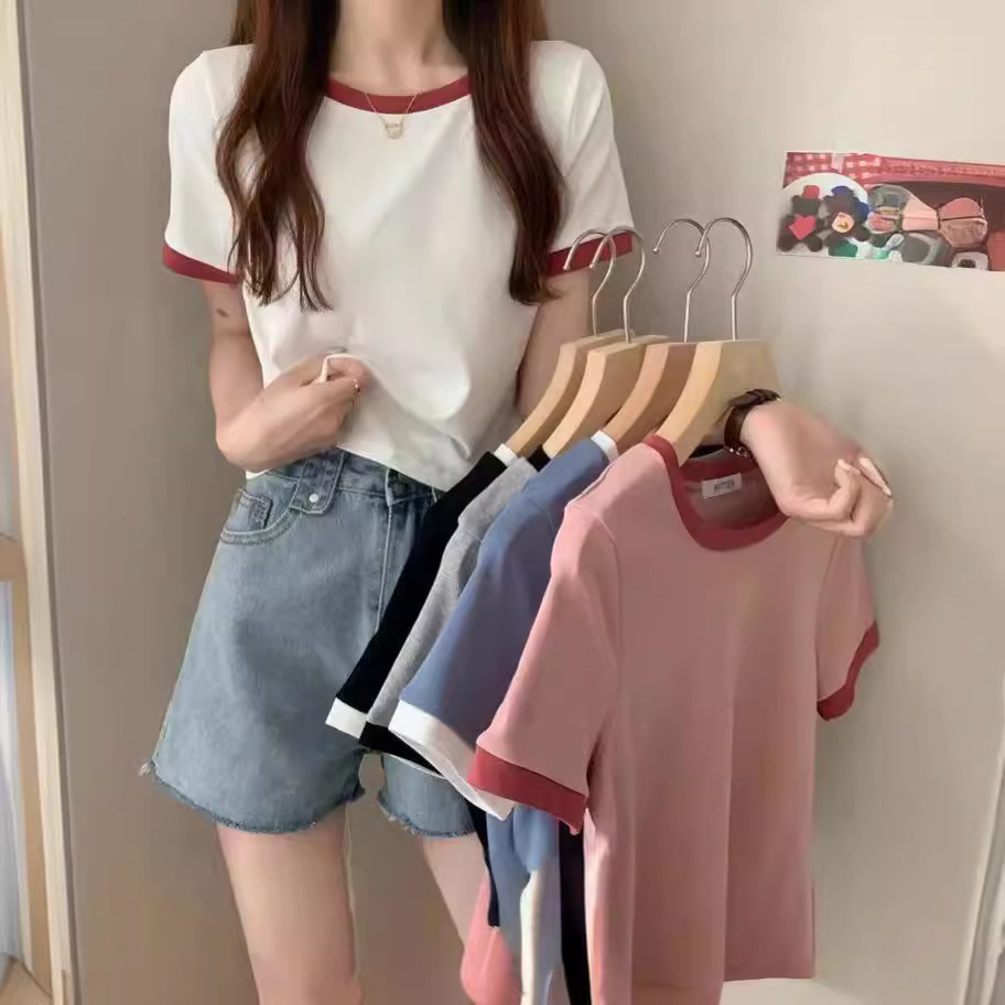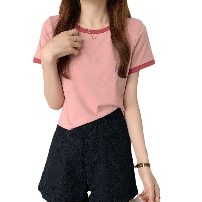 可爱学生Polo领短袖T恤女夏季修身显瘦半袖上衣小个子坑条打底衫