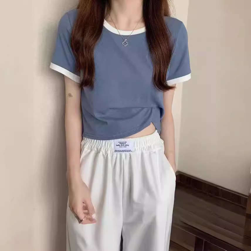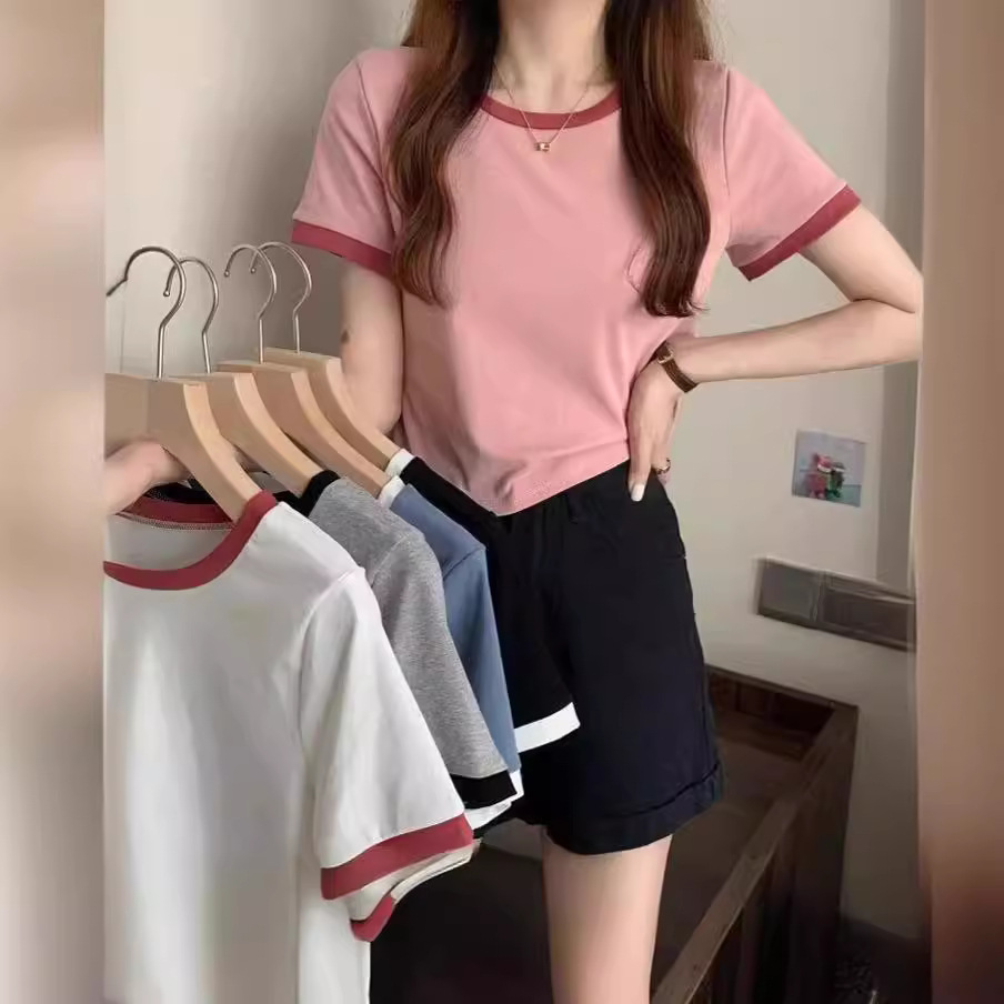多巴胺短袖显瘦辣妹高腰短款休闲T恤夏季正肩学生小众不规则上衣