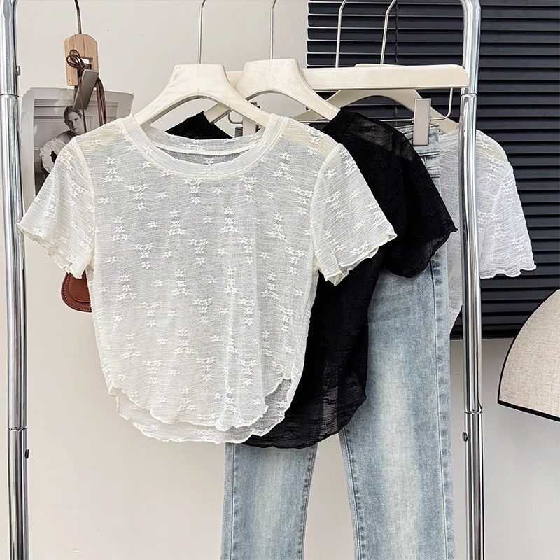 复古白色不规则镂空钩花短袖蕾丝上衣女夏季纯欲洋气叠穿微透罩衫