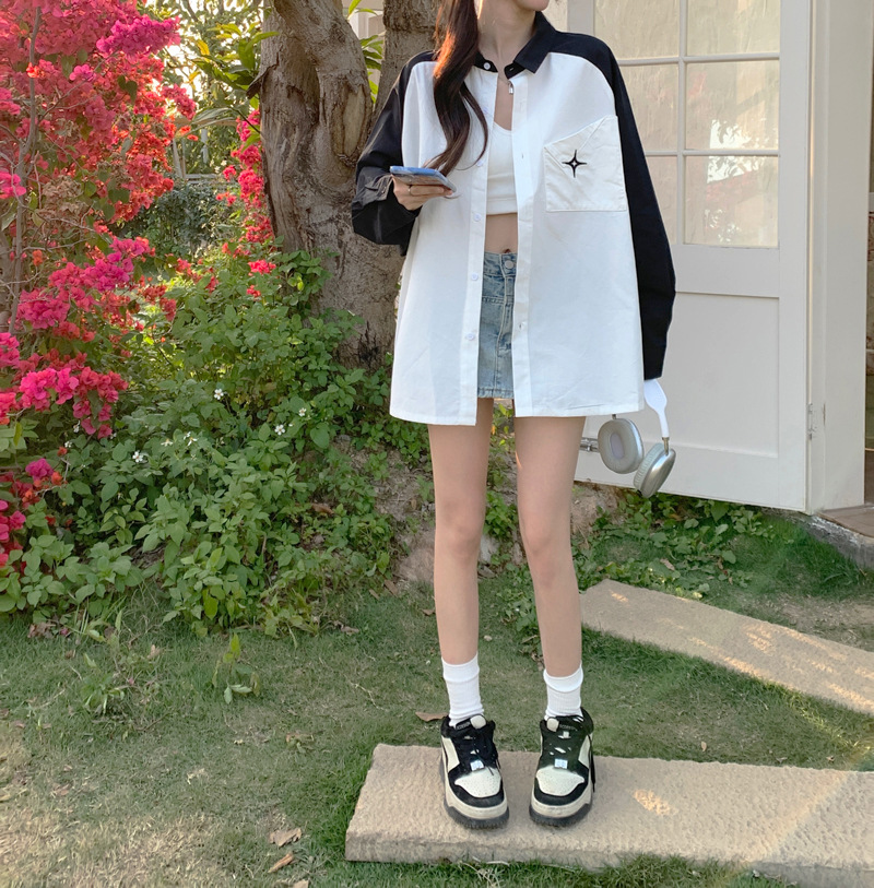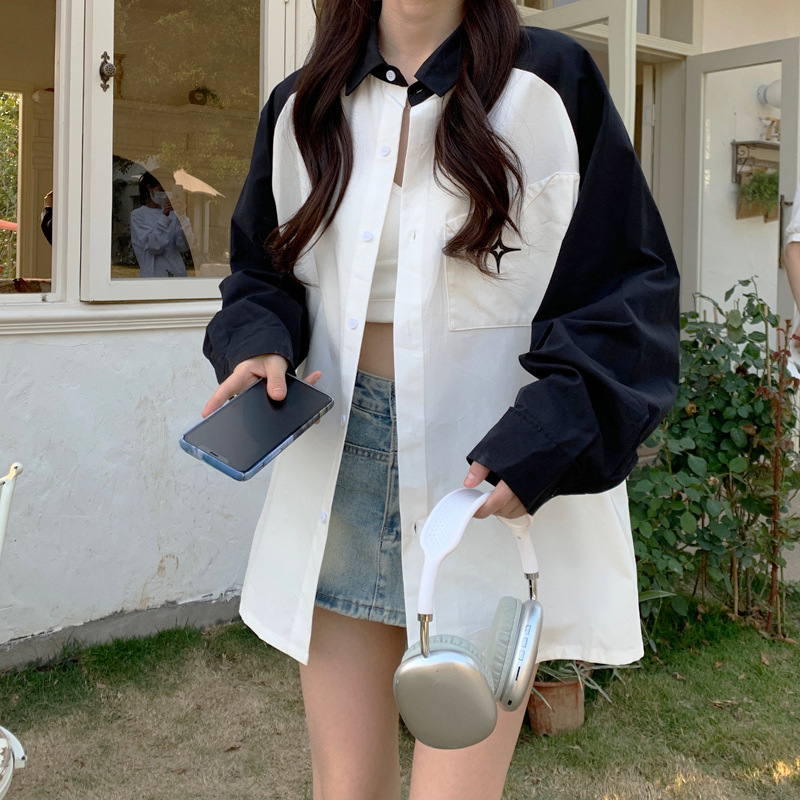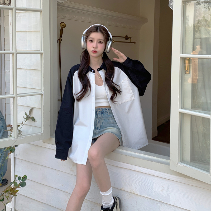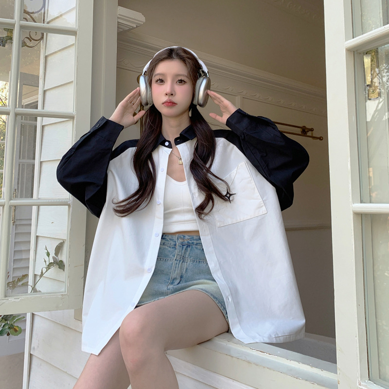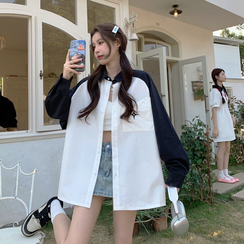 韩系学院风黑白拼接长袖衬衫女春秋设计感宽松小众情侣上衣潮