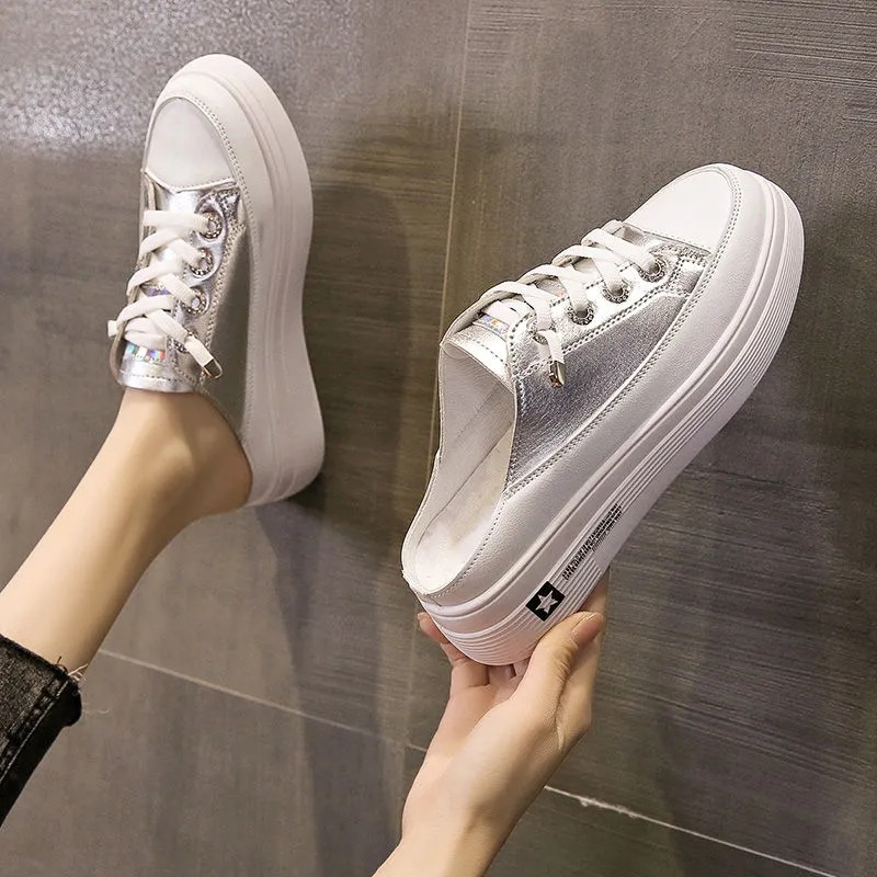 半托小白鞋女百搭春季新款无后跟懒人一脚蹬包头半拖鞋外穿