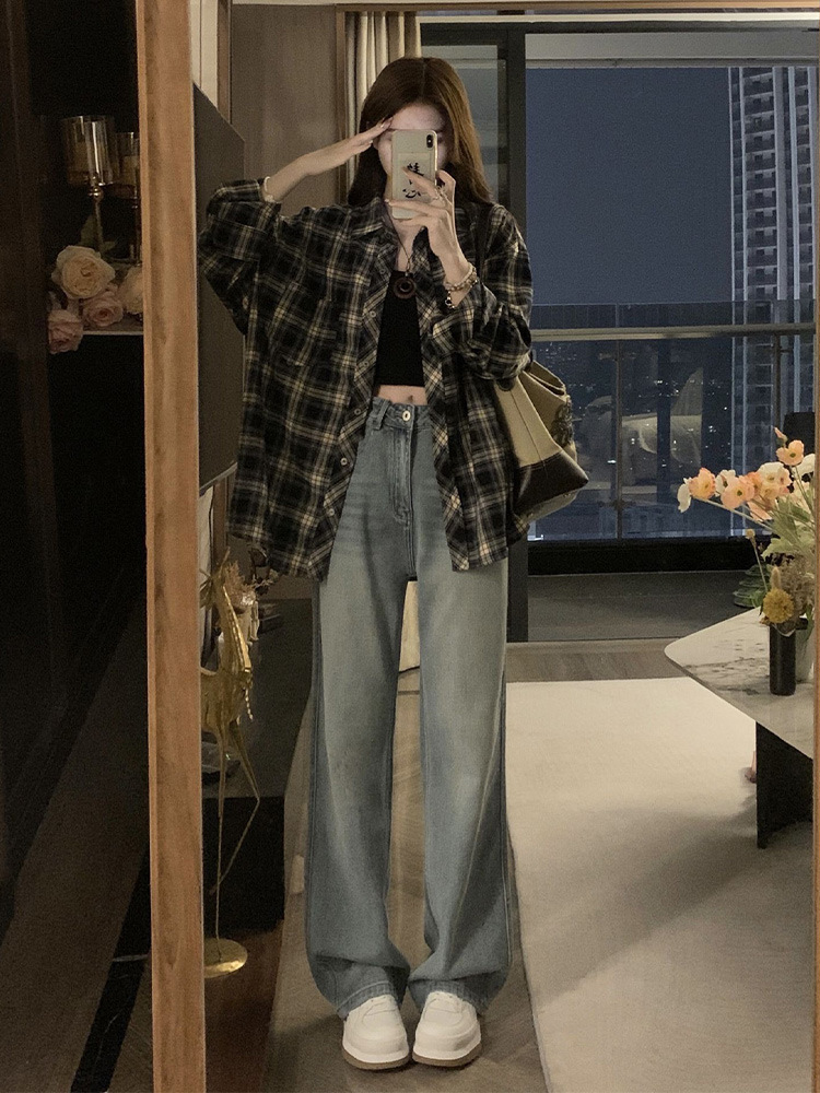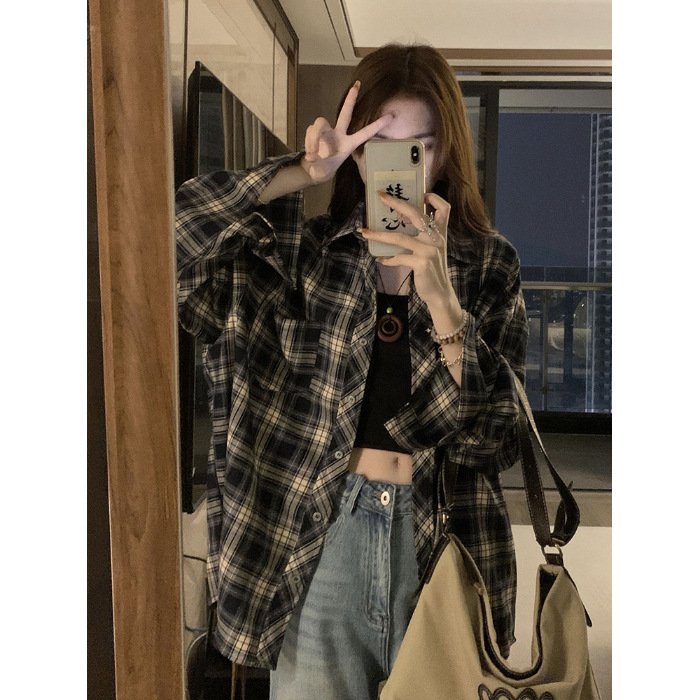 复古港风格子衬衫女春秋新款设计感衬衣开衫别致韩系上衣外套