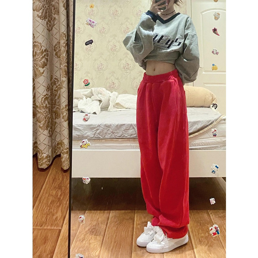 跨境货源红色高腰直筒阔腿卫裤女街舞嘻哈宽松休闲运动裤子夏季潮