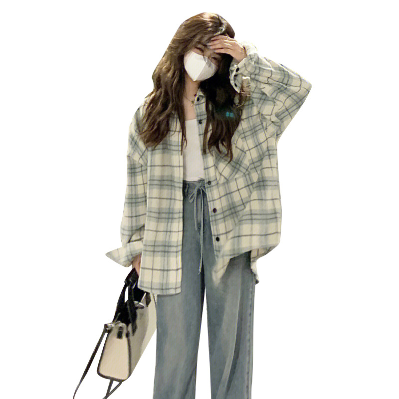 奶希穿搭设计感小众早秋衬衫外套女艺术生POLO领减龄长袖格子开衫
