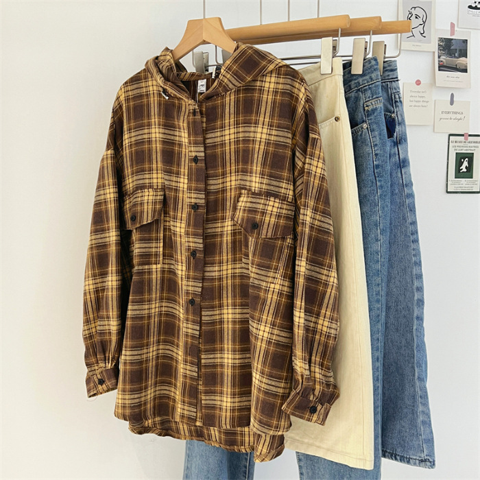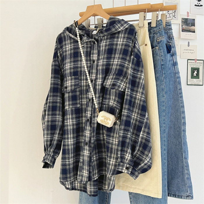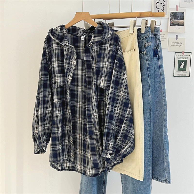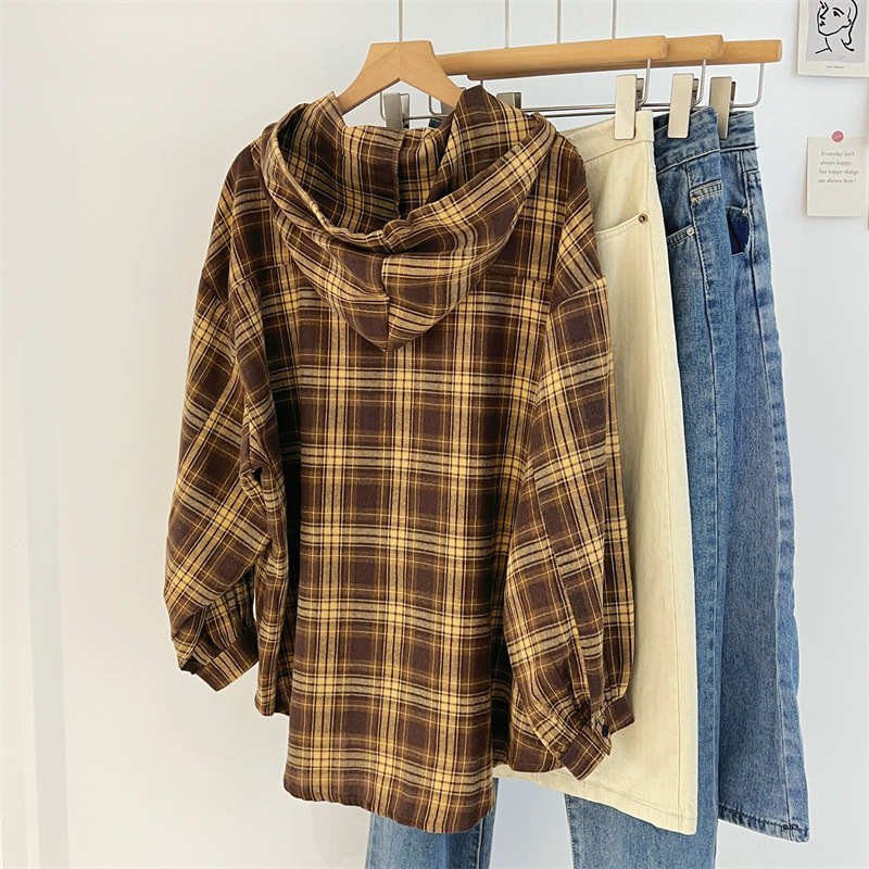 复古连帽格子长袖衬衫女春秋宽松慵懒显瘦中长款衬衣休闲外套