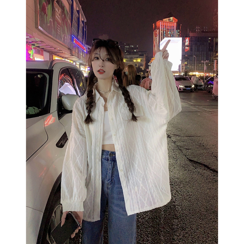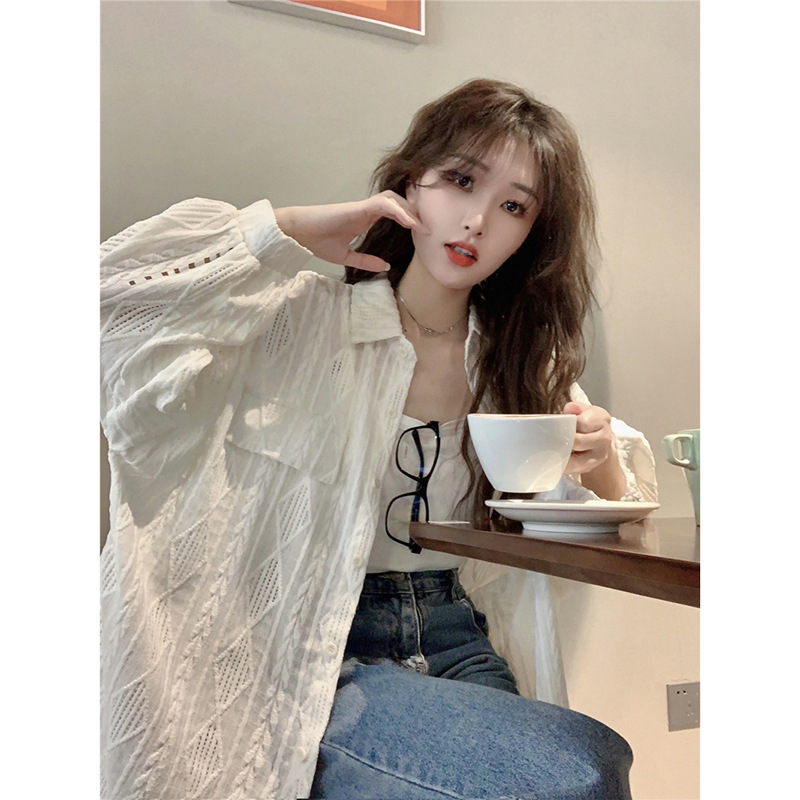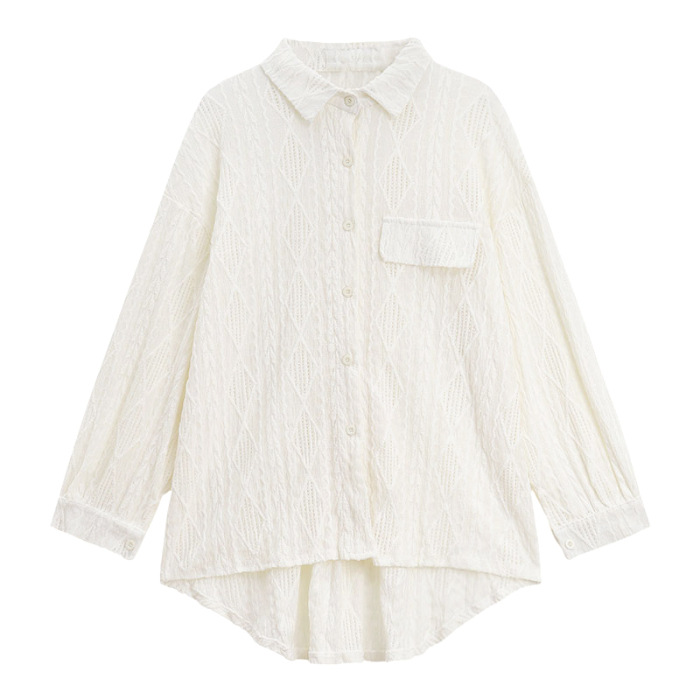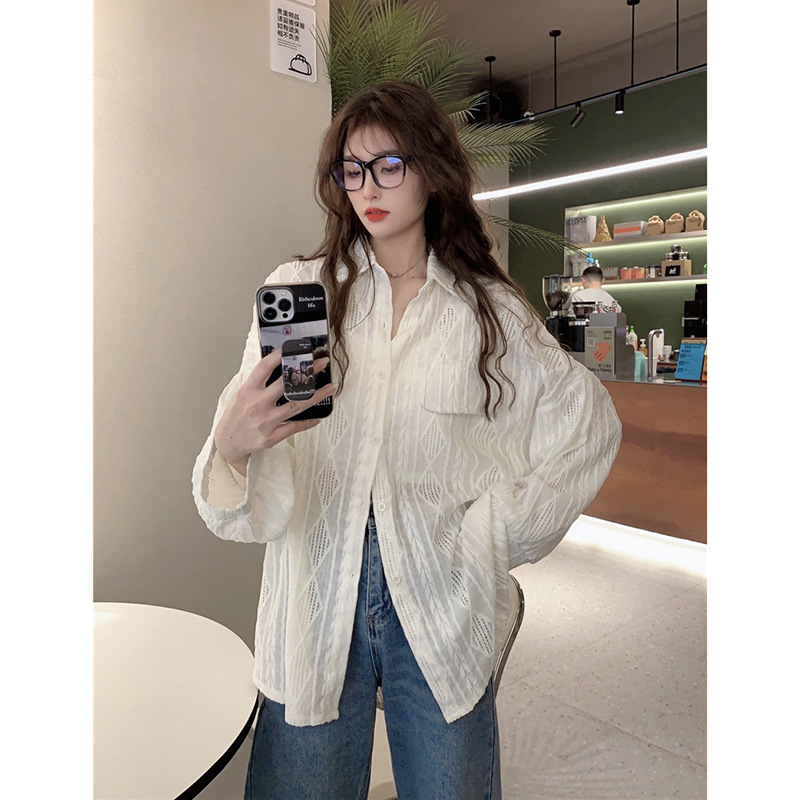 年春秋新款休闲钩花镂空衬衣设计感小众女装显瘦杏色衬衫上衣