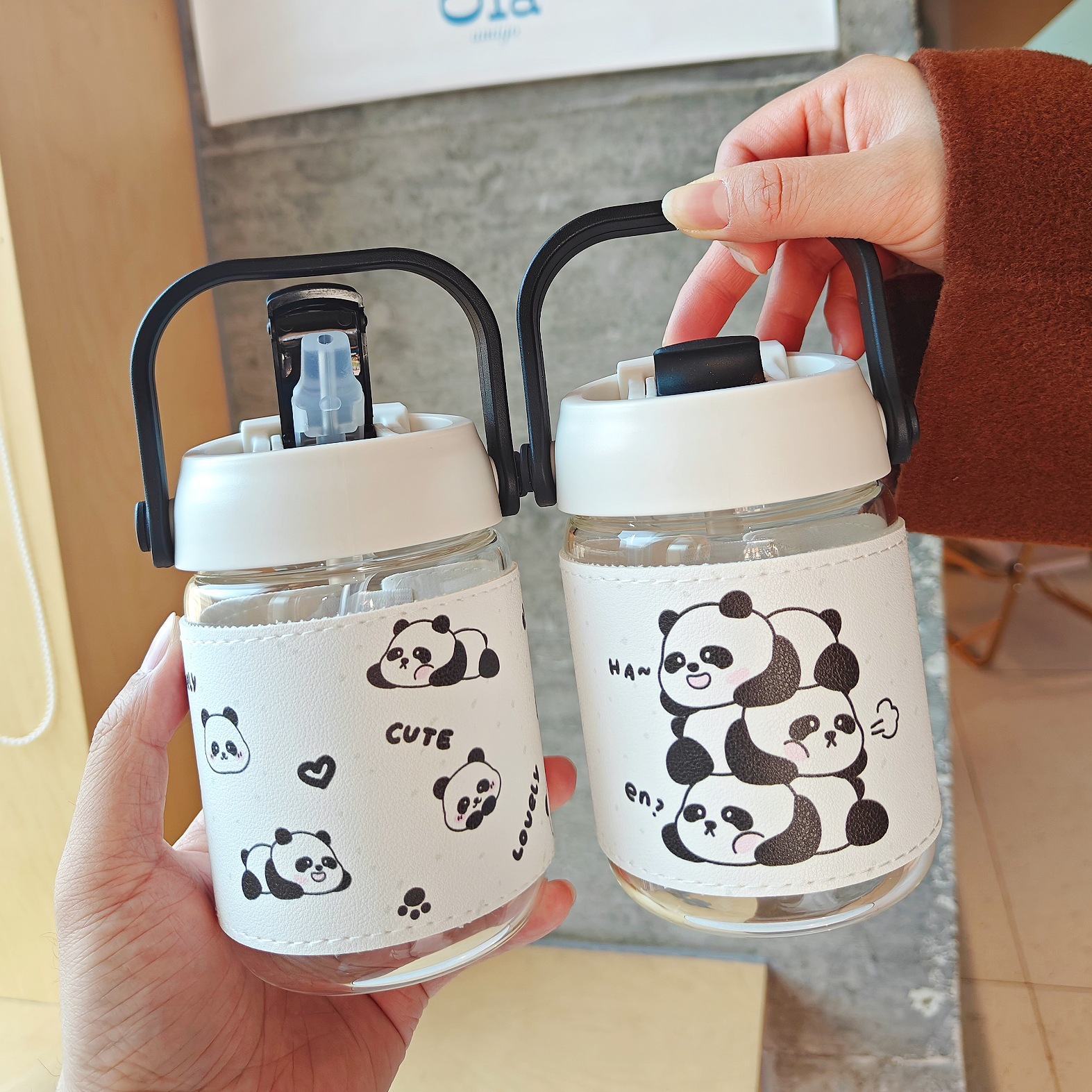 新款熊猫玻璃杯便携手提大容量吸管杯双饮水杯皮套防烫水杯礼品杯