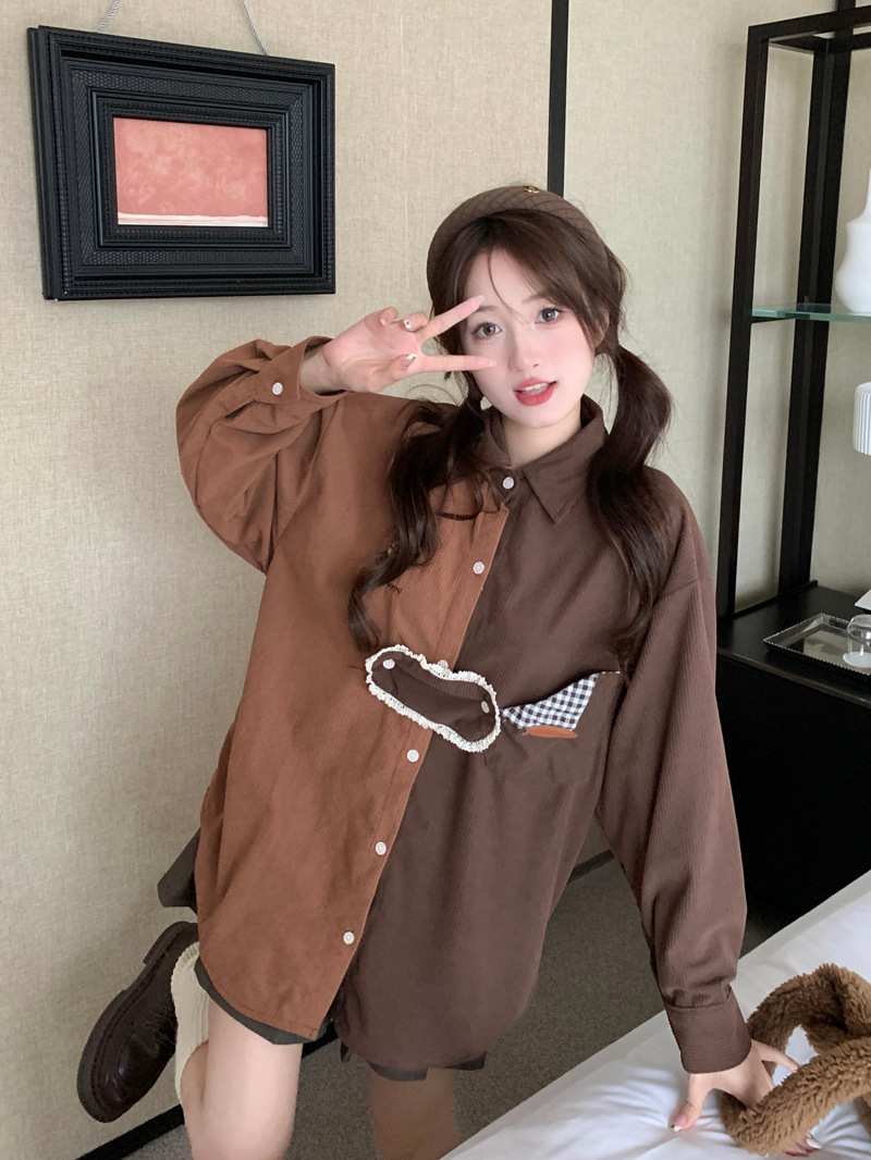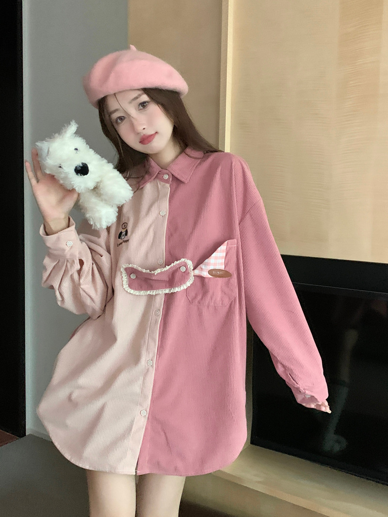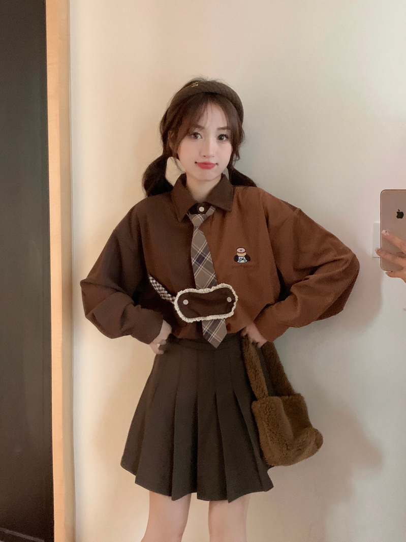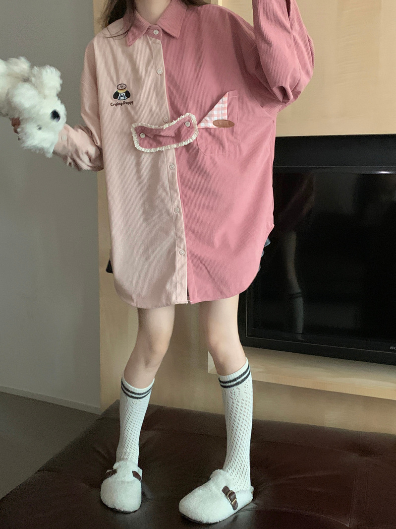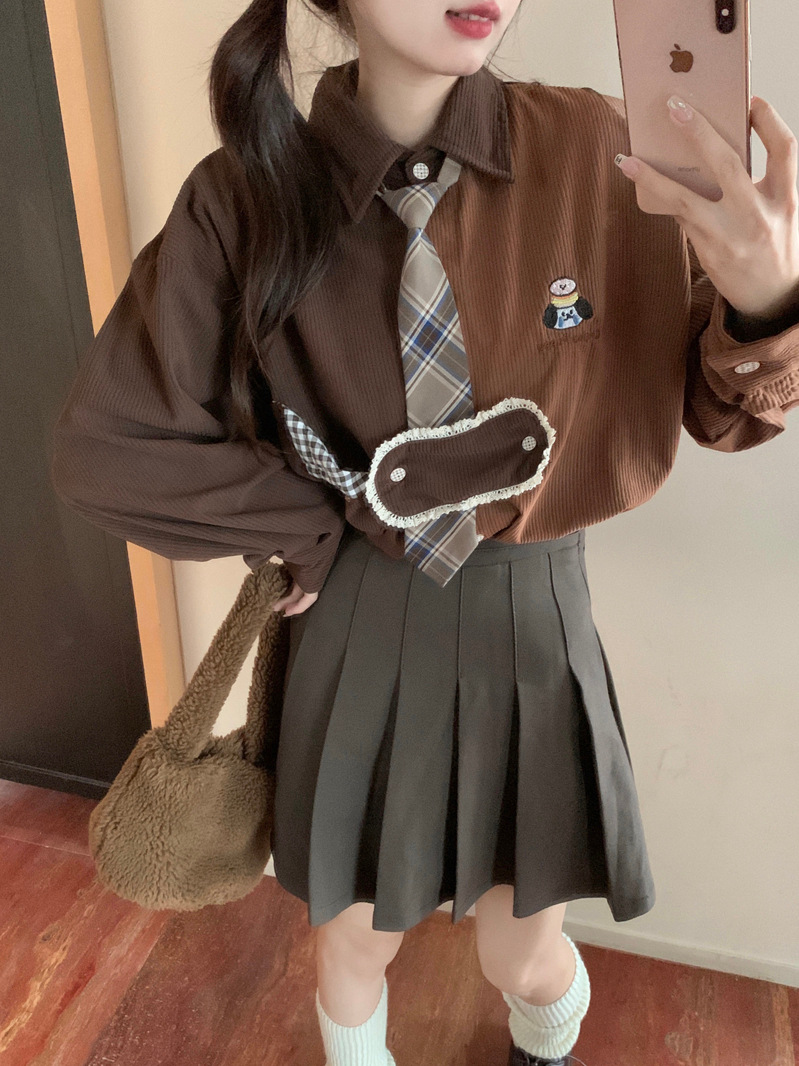 可爱少女风拼接撞色灯芯绒衬衫裙女秋冬新款衬衣带领带短裙子