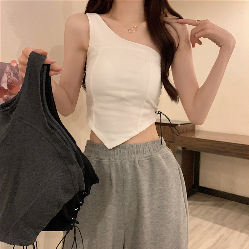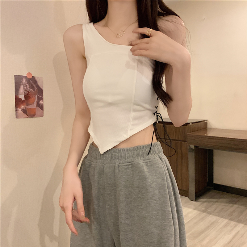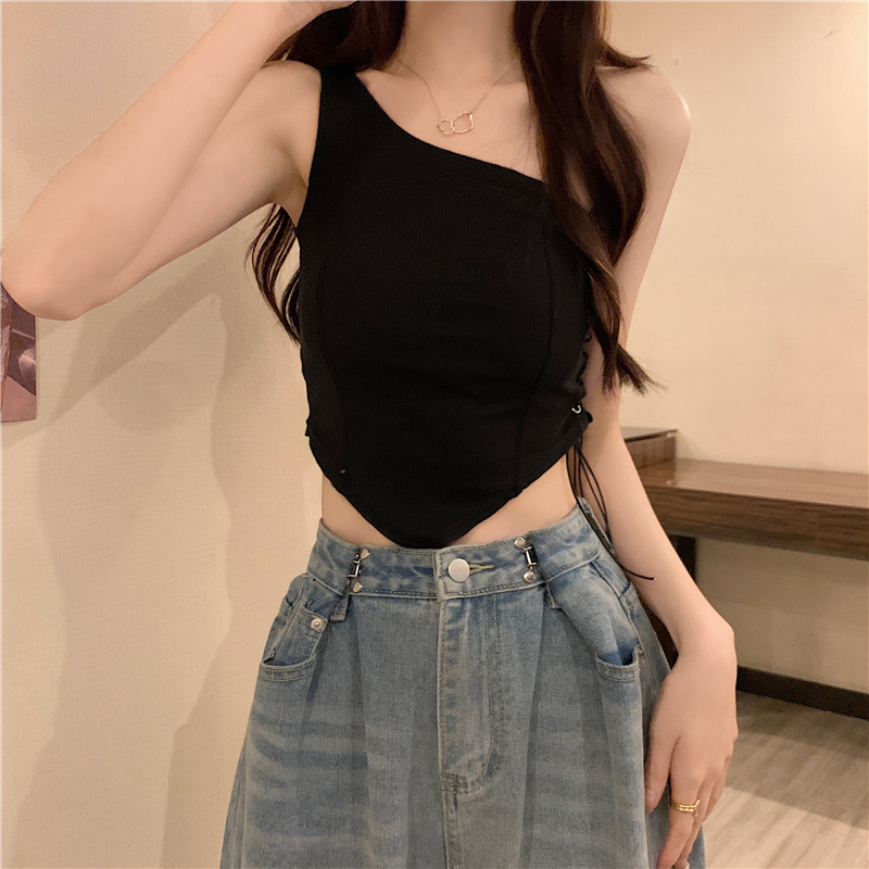夏季辣妹纯欲风不规则设计感系绳小吊带小心机露背单肩带胸垫上衣