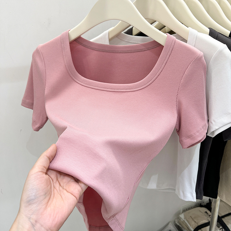 粉色螺纹短袖t恤女夏季新款设计感纯欲锁骨方领修身短款上衣女潮
