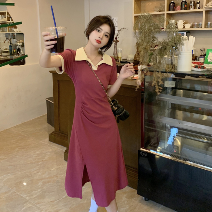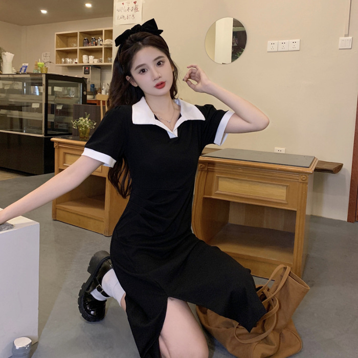 小众设计感撞色Polo领连衣裙女夏季胖MM收腰显瘦侧边开叉过膝长裙
