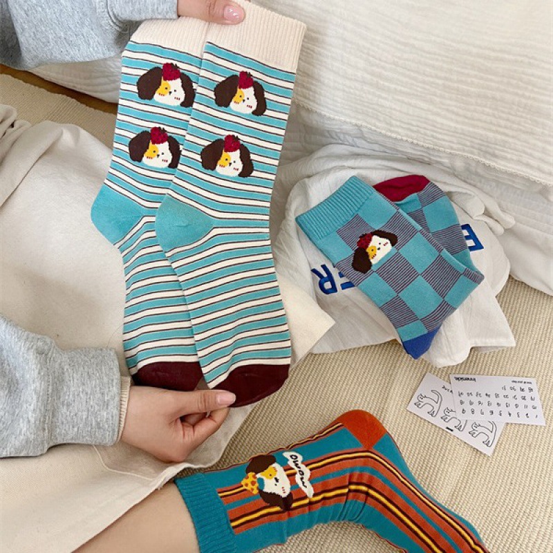 袜子女春季新款ins卡通可爱创意百搭条纹少女棉袜中筒甜美堆堆袜