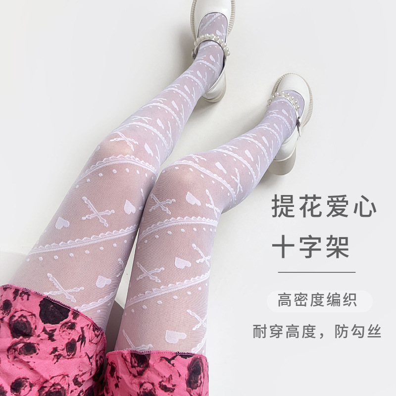 日系lolita连裤袜jk白丝袜子女春夏季爱心条纹提花丝袜黑丝洛丽塔