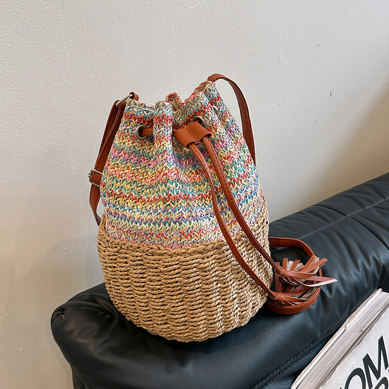 小众设计单肩斜挎水桶编织包波西米亚文艺复古小清新休闲草编包夏