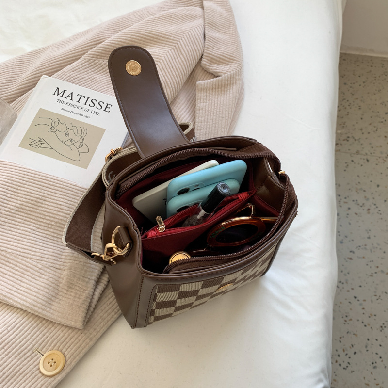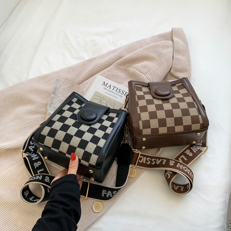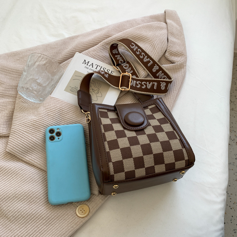休闲棋盘格水桶包时尚新款宽肩带单肩包新款包包女斜挎包
