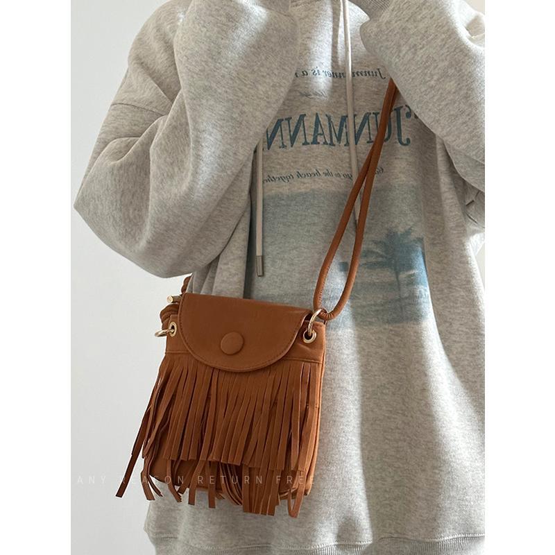 包包女新款复古手工仿麂皮绒流苏包手机包百搭单肩斜挎小方包