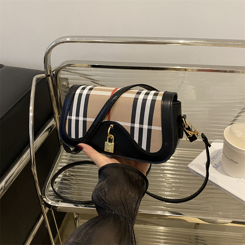 时尚格子手提包包女秋季小众设计质感通勤马鞍包单肩斜挎包