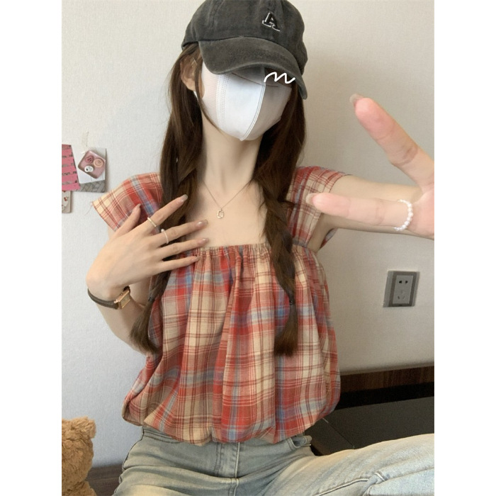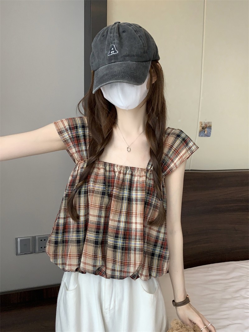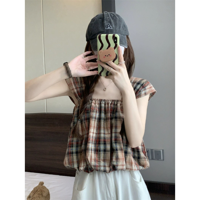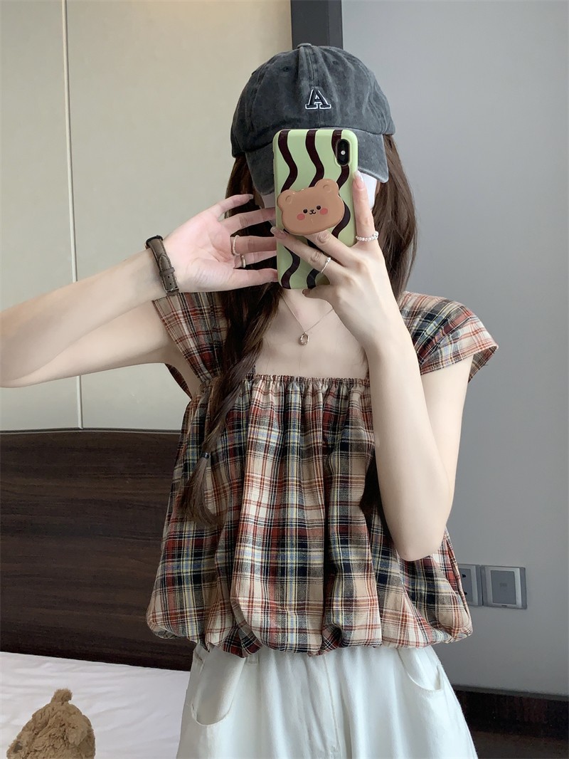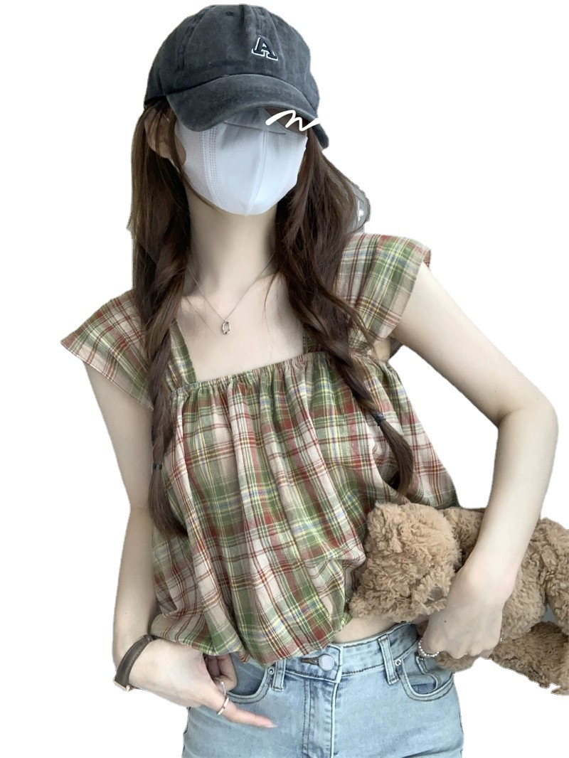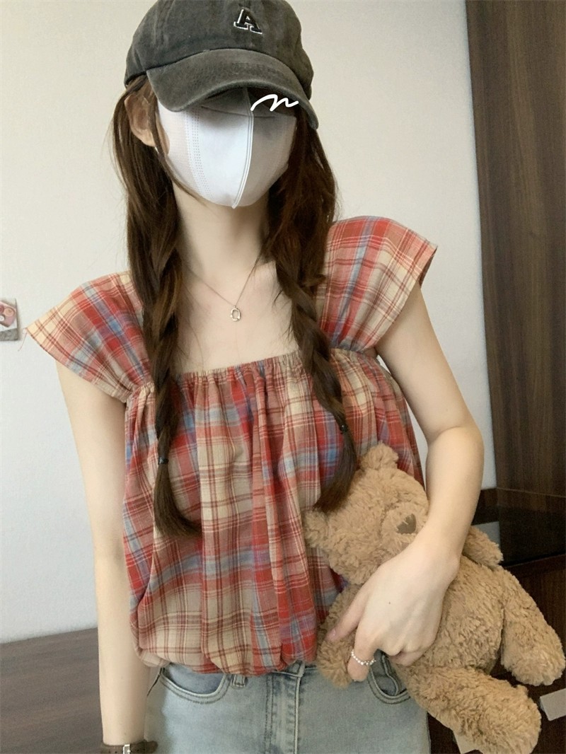 小众背心法式甜美格纹吊带衫夏季新款韩版度假风木耳边上衣