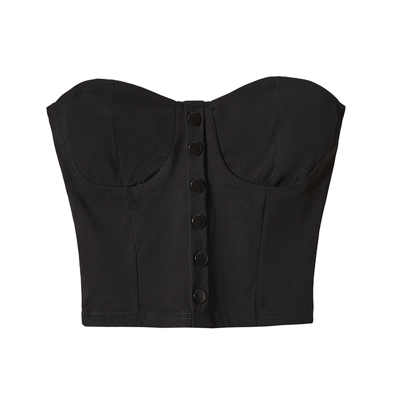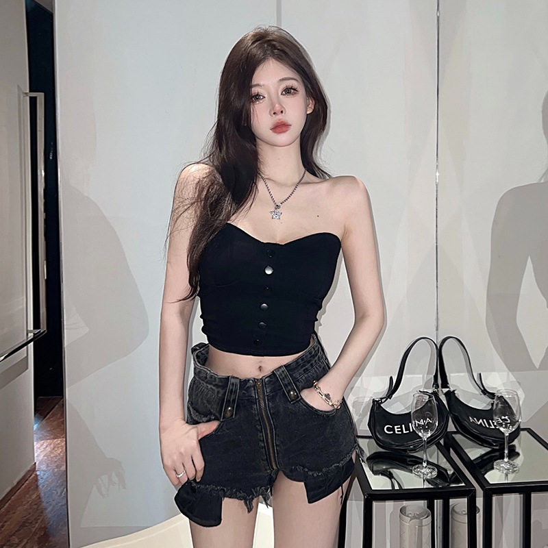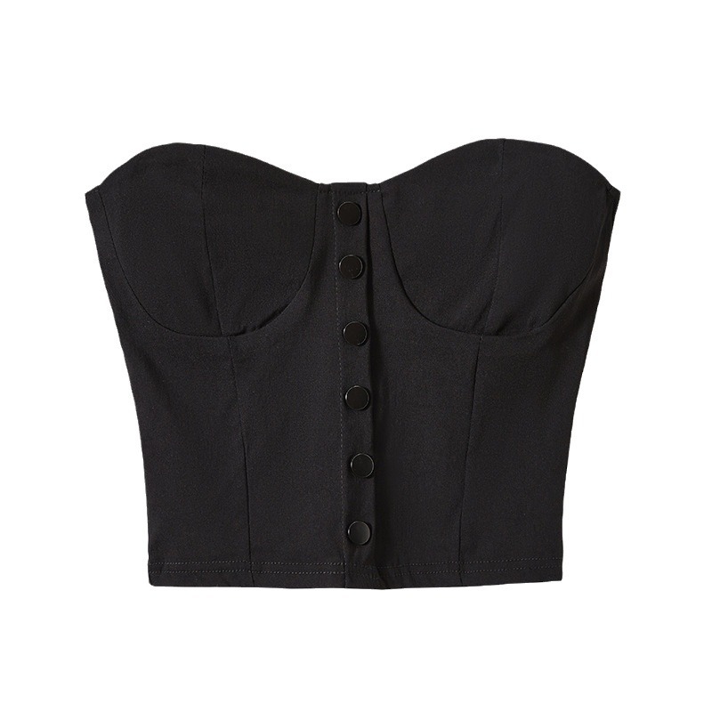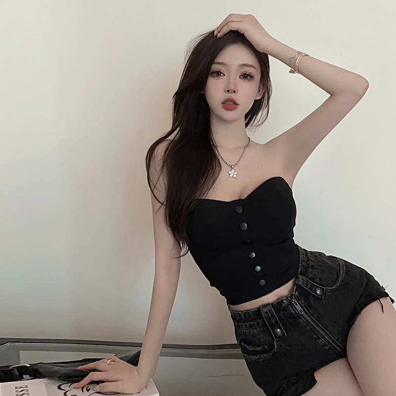 网红性感裹胸上衣女收腰一字领露肩显胸性感紧身黑色抹胸短款背心