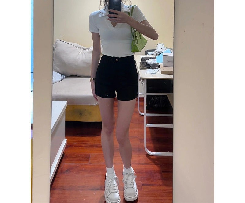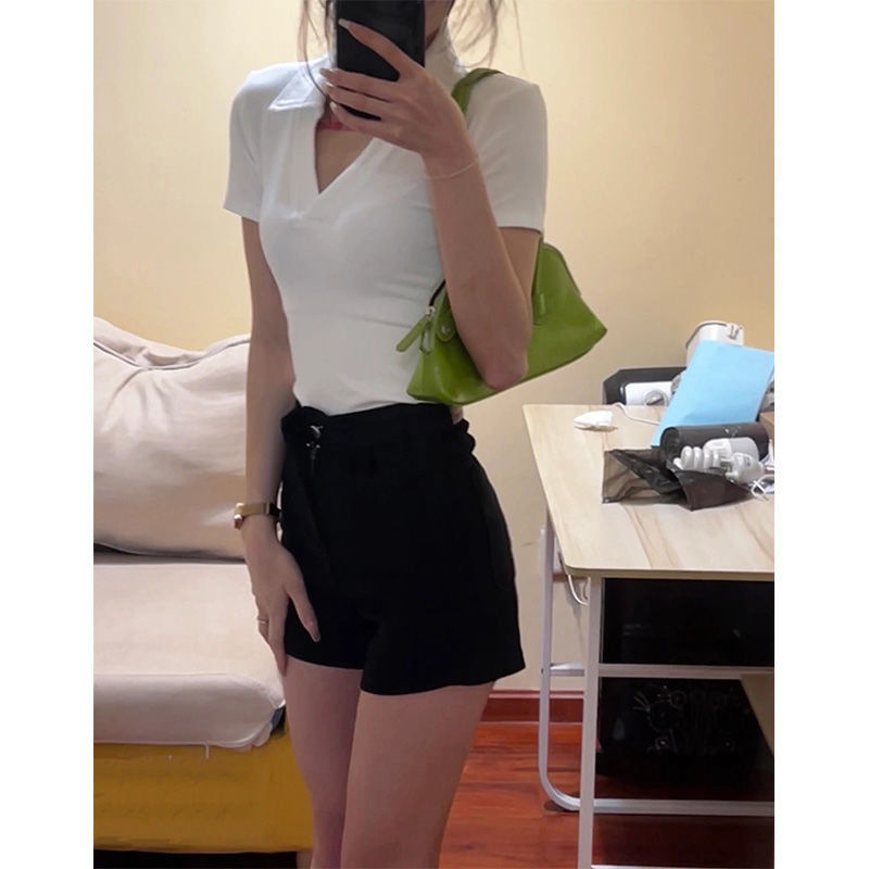 V领修身显瘦正肩短袖t恤polo衫翻领女夏新款纯欲性感辣妹上衣