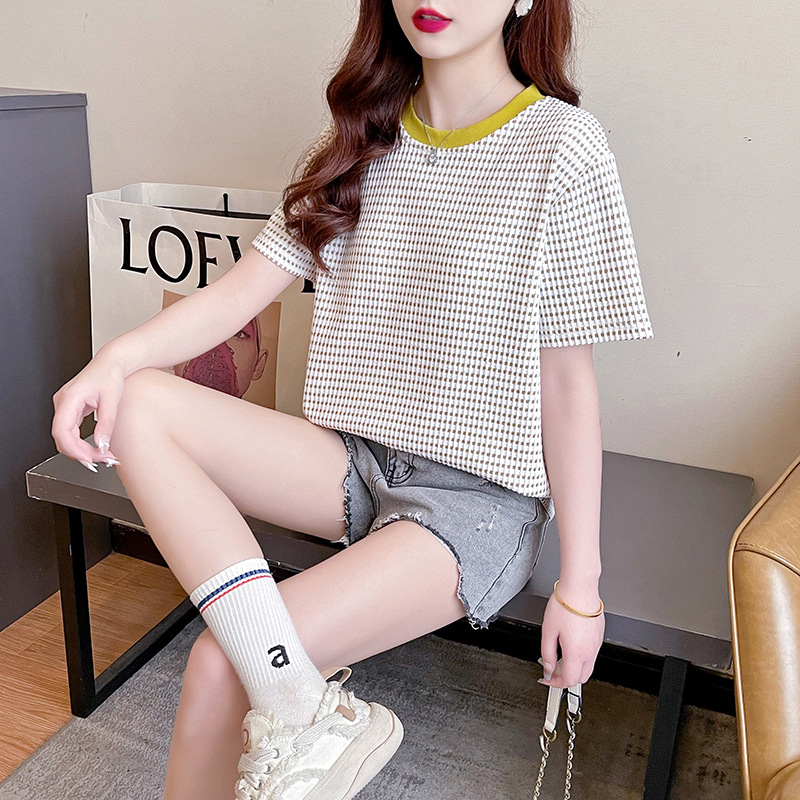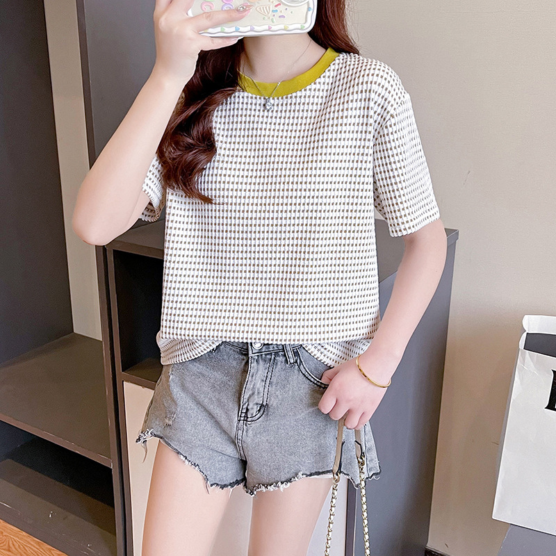 夏季新款短袖减龄粉色格子圆领上衣服小众正肩条纹T恤女ins潮