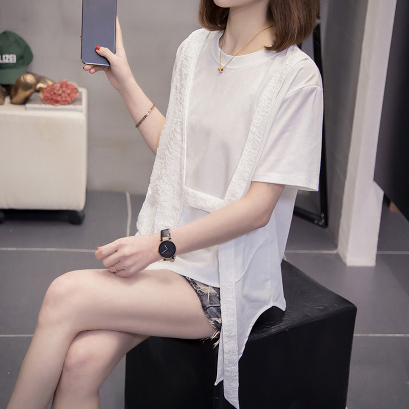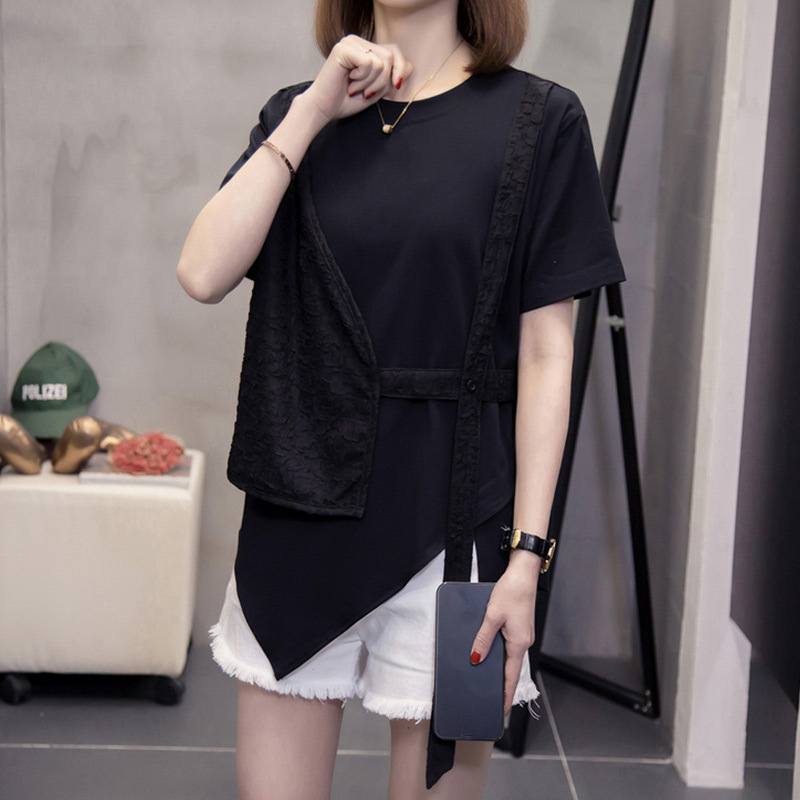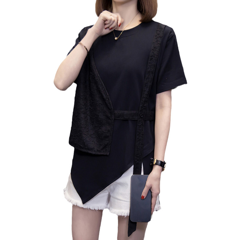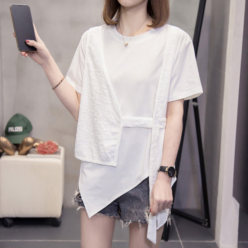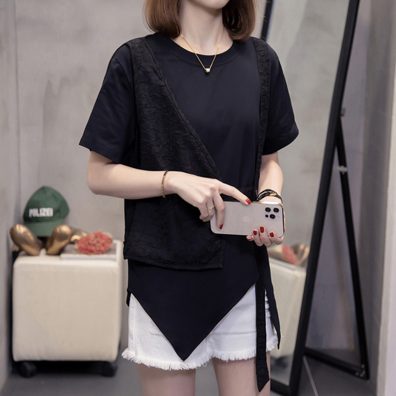 设计感假两件短袖T恤女夏大码胖mm中长款收腰显瘦不规则开叉上衣
