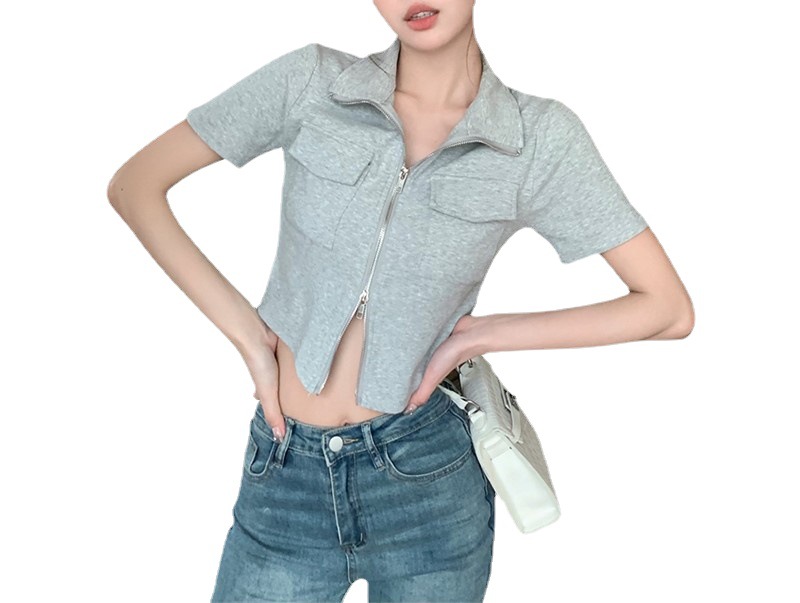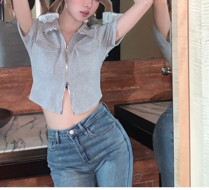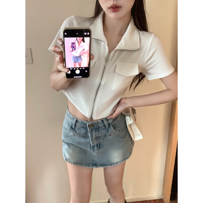 辣妹上衣T恤女ins潮夏季新款修身显瘦Polo领拉链短袖打底衫