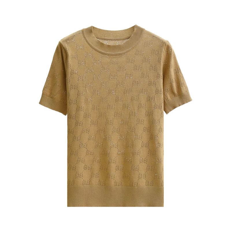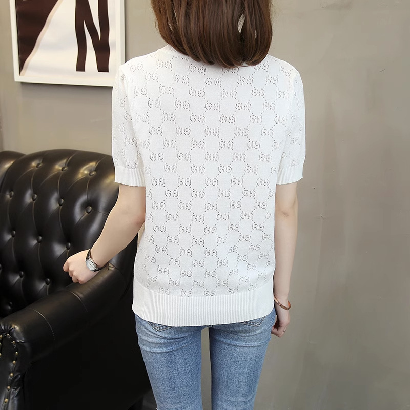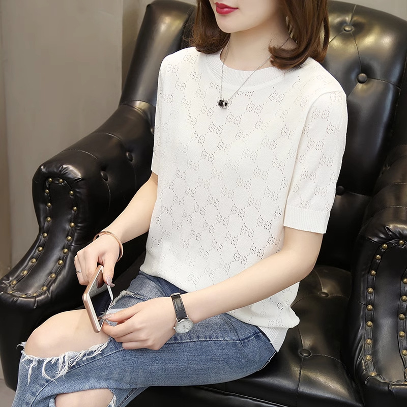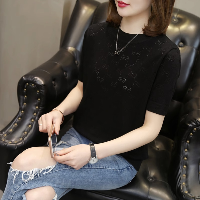 夏薄款时尚小众短袖t恤女圆领镂空针织衫宽松显瘦打底衫外穿上衣