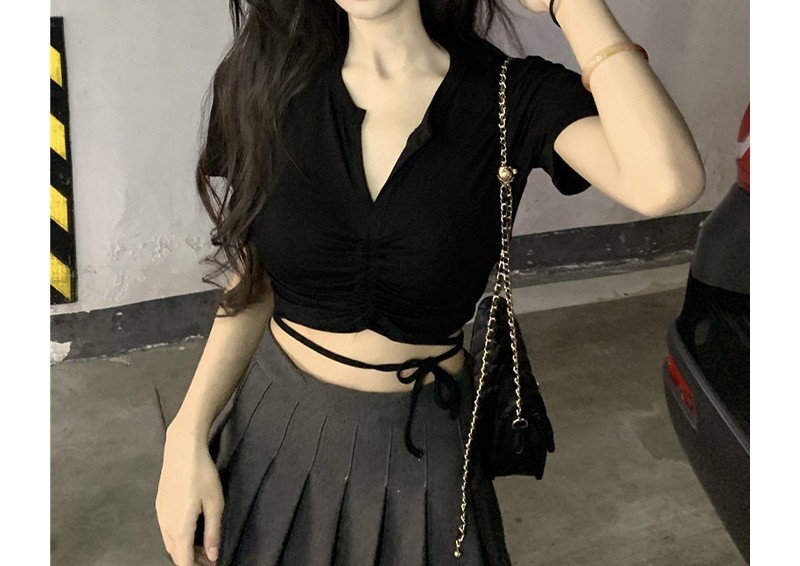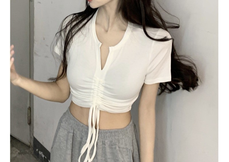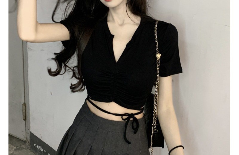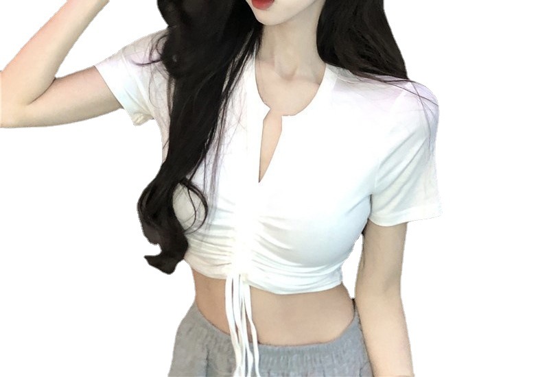 不规则抽绳v领正肩短袖t恤女夏季设计感辣妹高腰修身短款露脐上衣