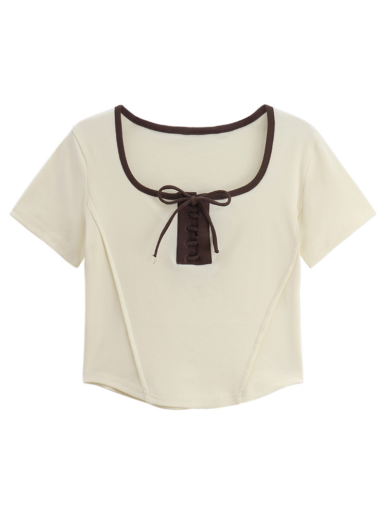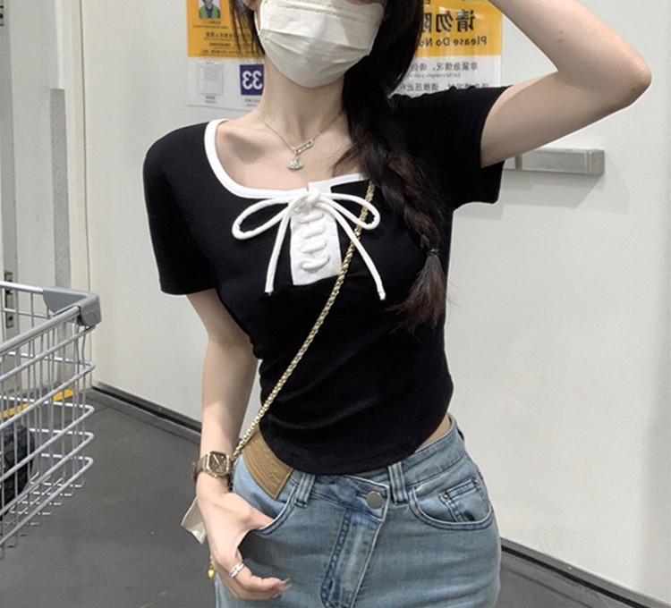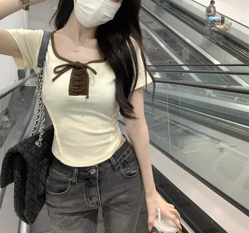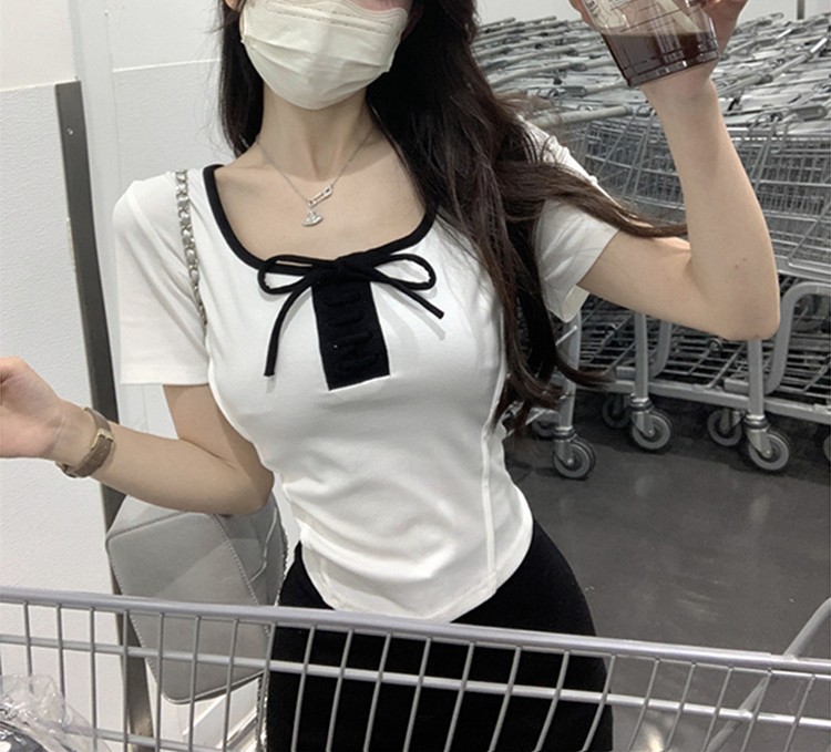 蝴蝶结短款方领t恤夏季新款设计感小众辣妹性感遮肉正肩上衣