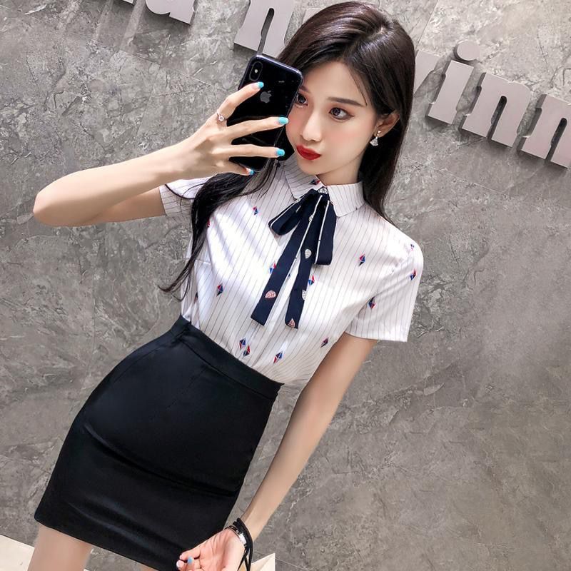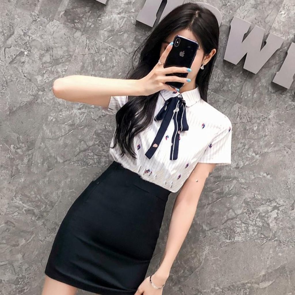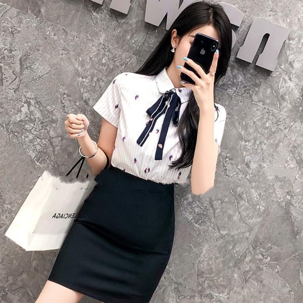 白色上衣配领带+包臀裙