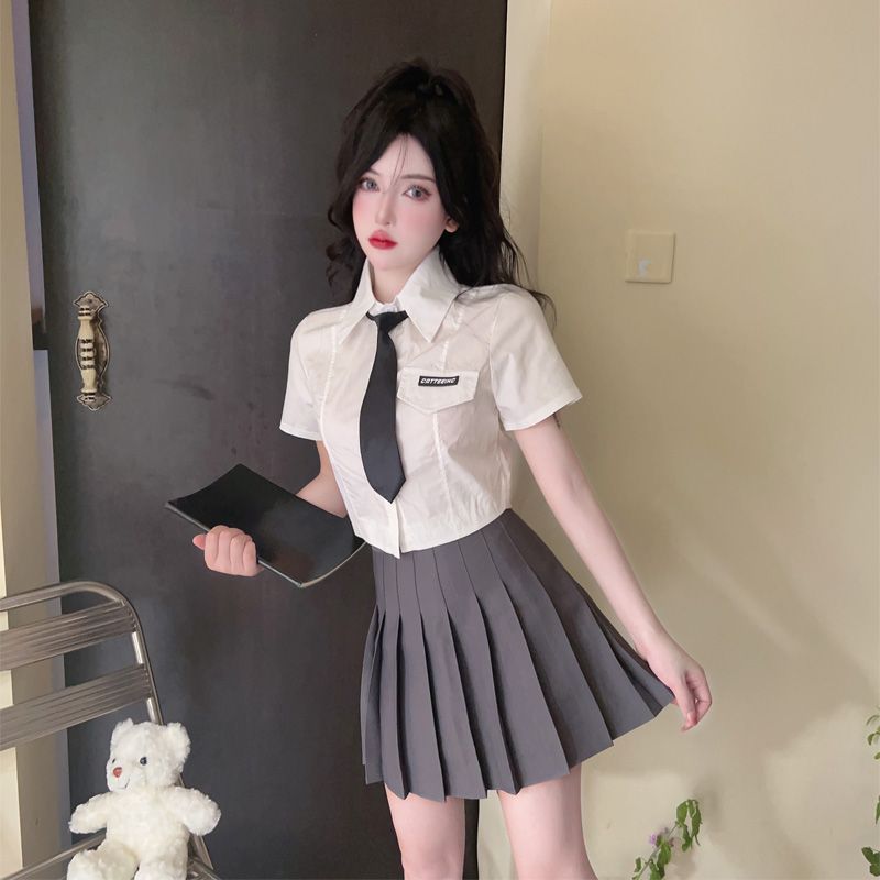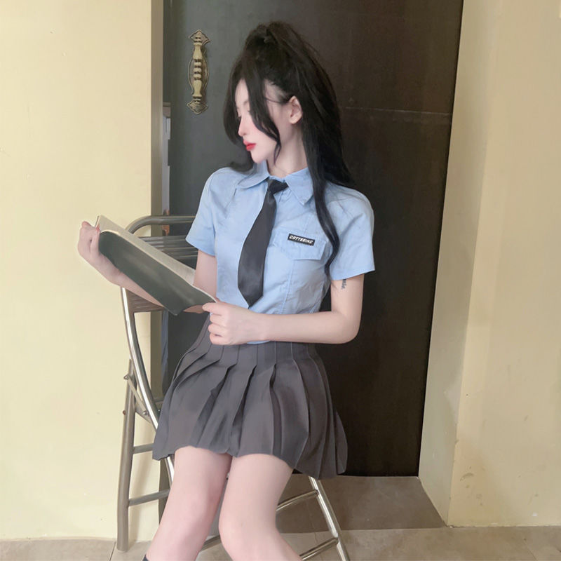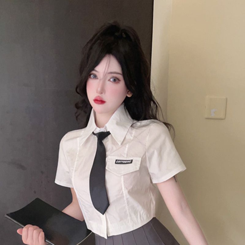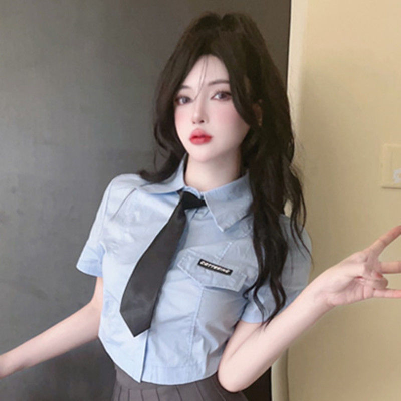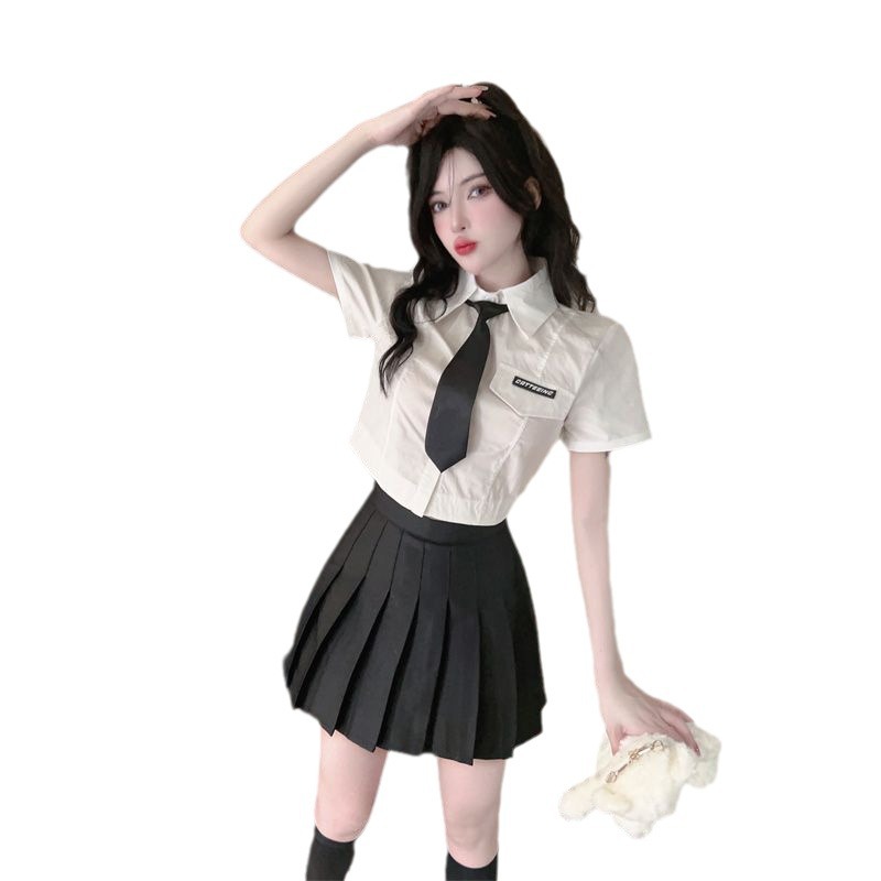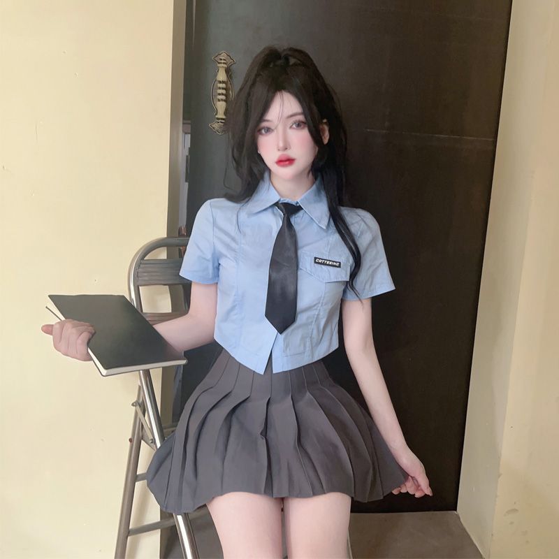短款衬衫女甜辣学院风显瘦高腰修身气质短袖上衣+百褶裙jk减齢ins