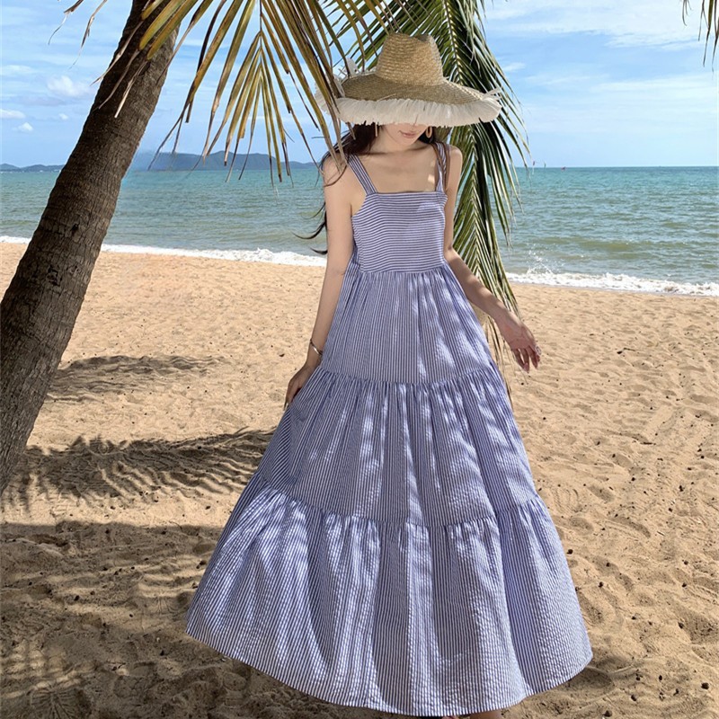 夏季新款度假风法式泡泡肌理宽松大裙摆海边仙女裙抽褶吊带连衣裙
