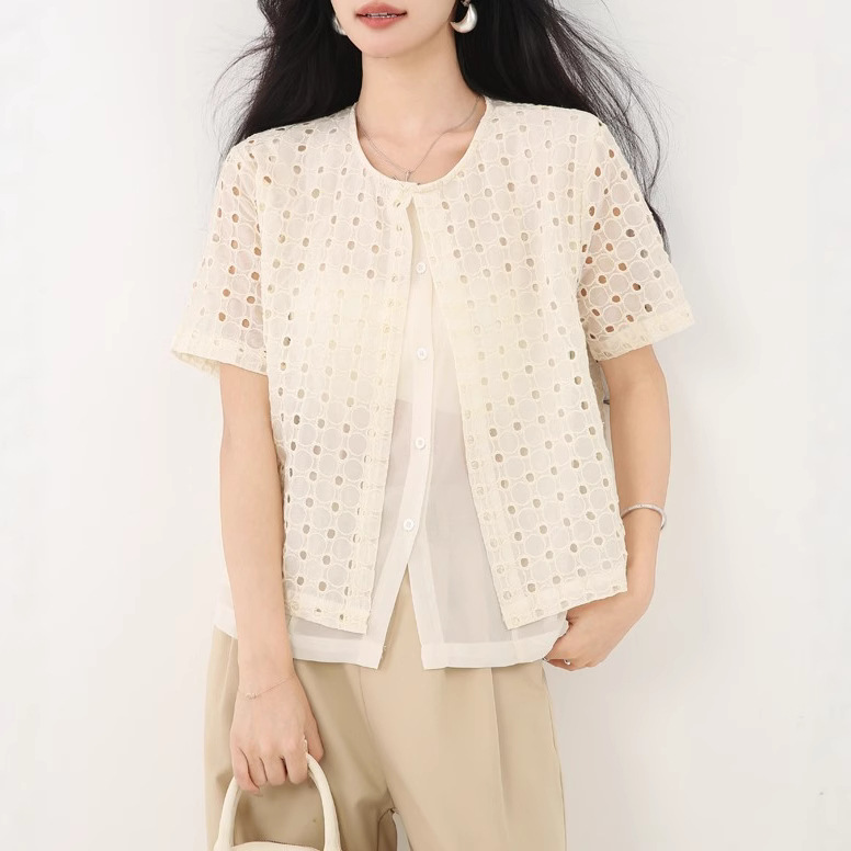 强烈推荐~假两件短袖衬衫女夏2025新款时尚小众钩花镂空衬衣上衣