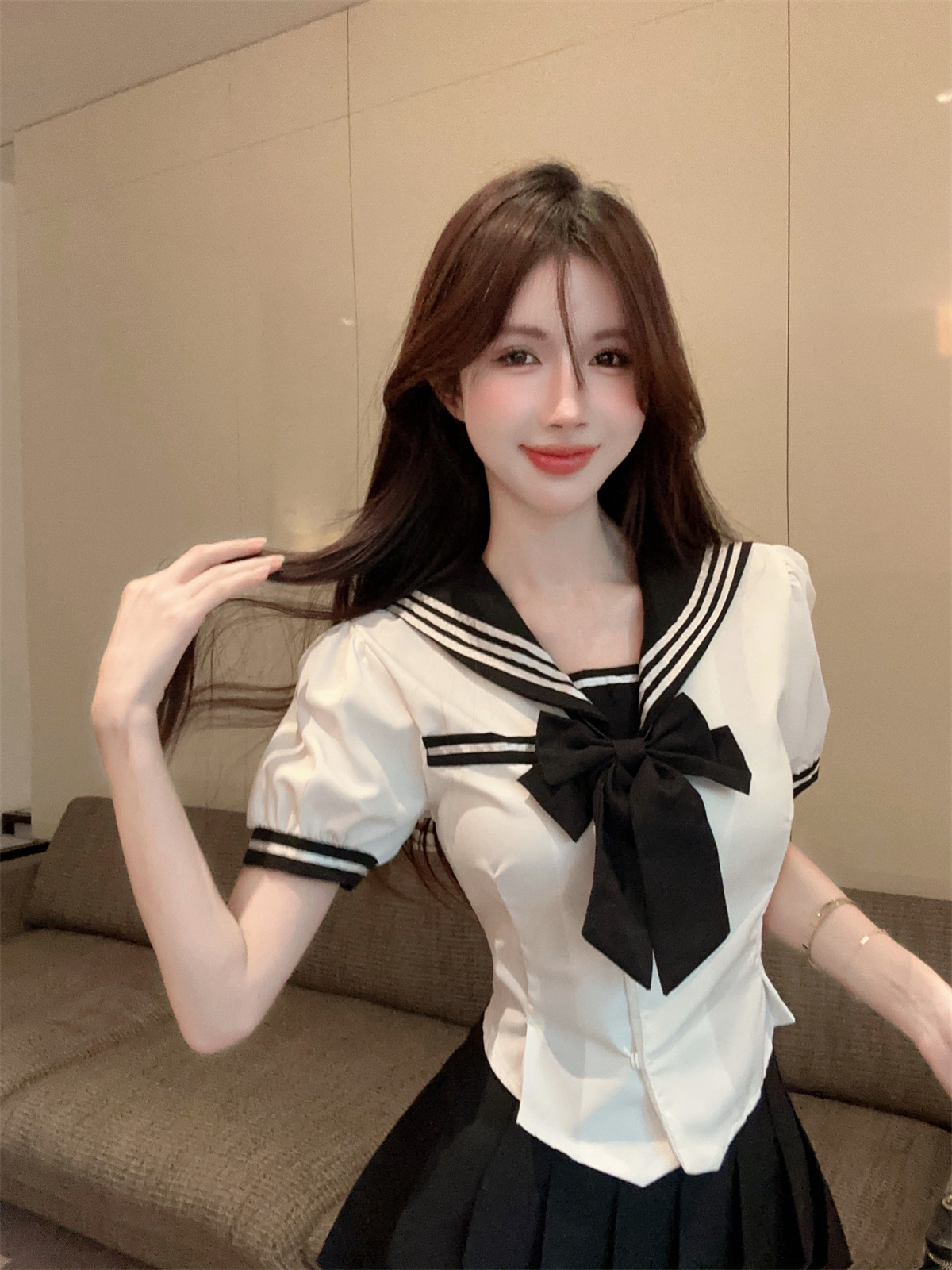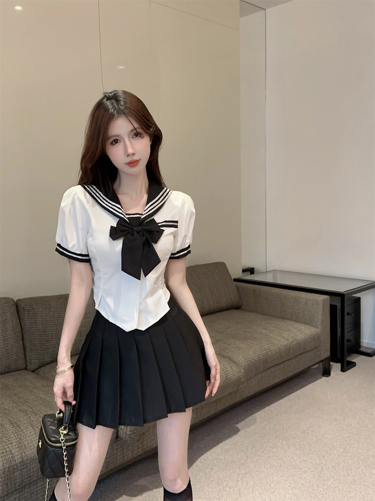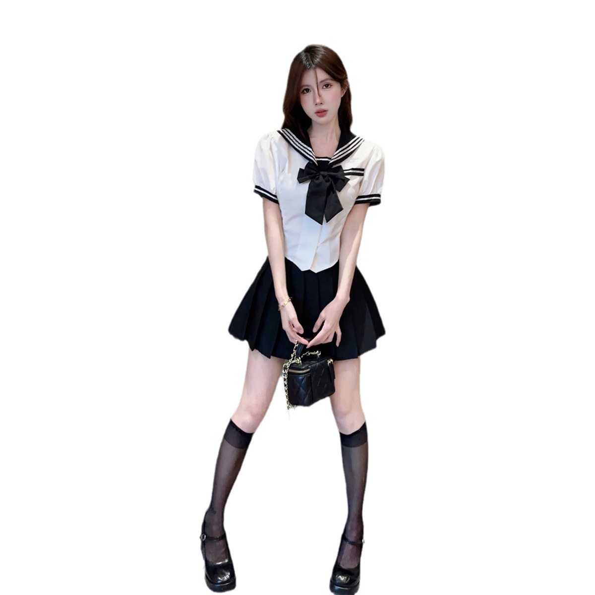 美式jk制服套装学院风小清新减龄收腰短袖衬衫高腰百褶裙两件套夏