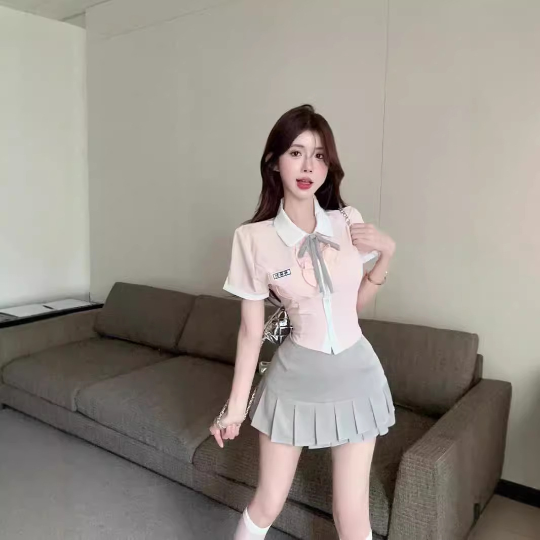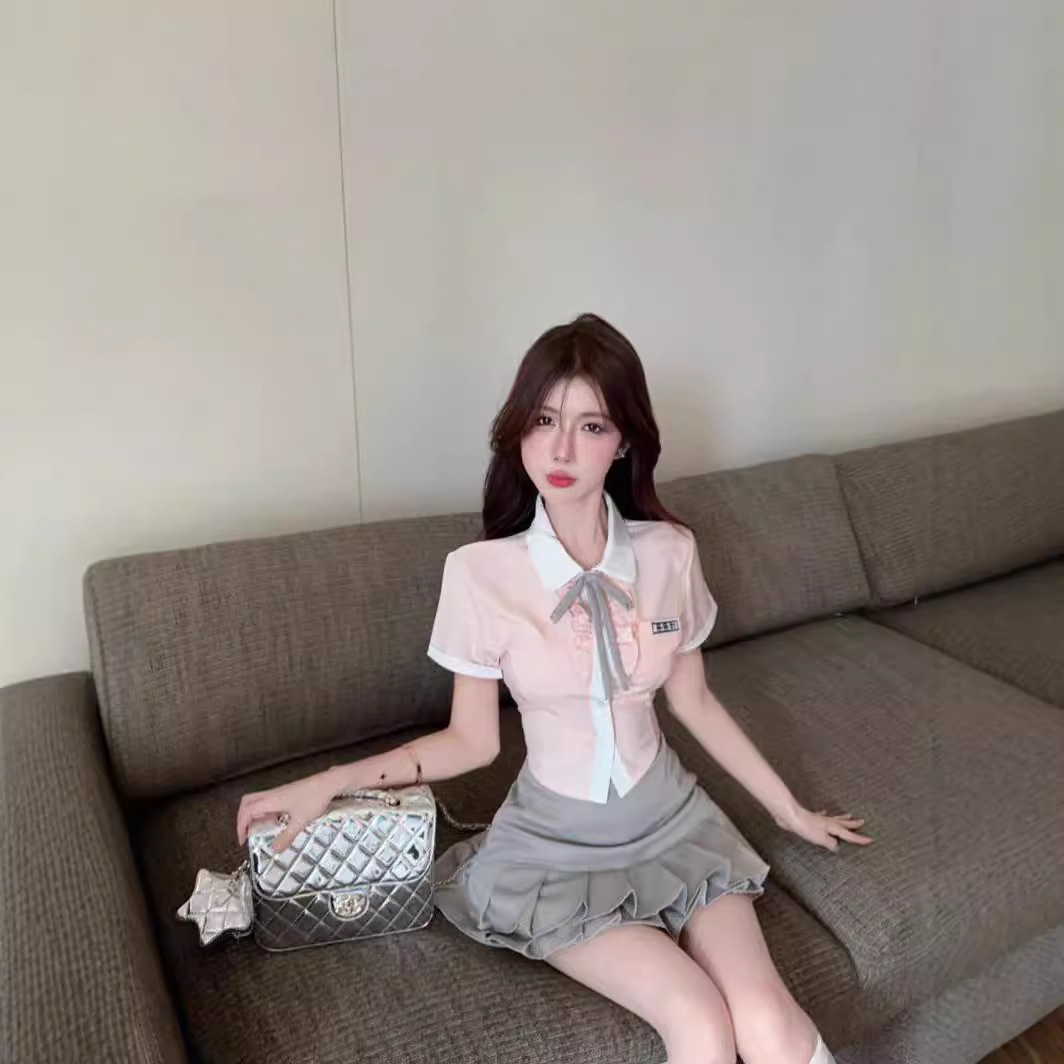 韩系JK制服纯欲学院风套装女设计感甜美蝴蝶结粉衬衫百褶裙两件套