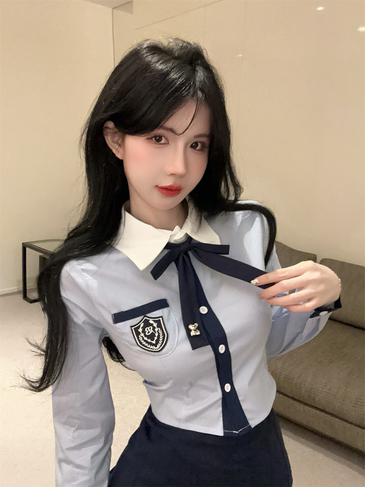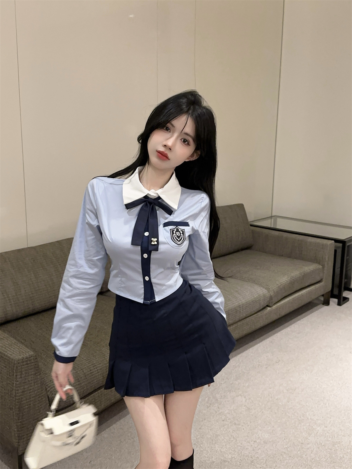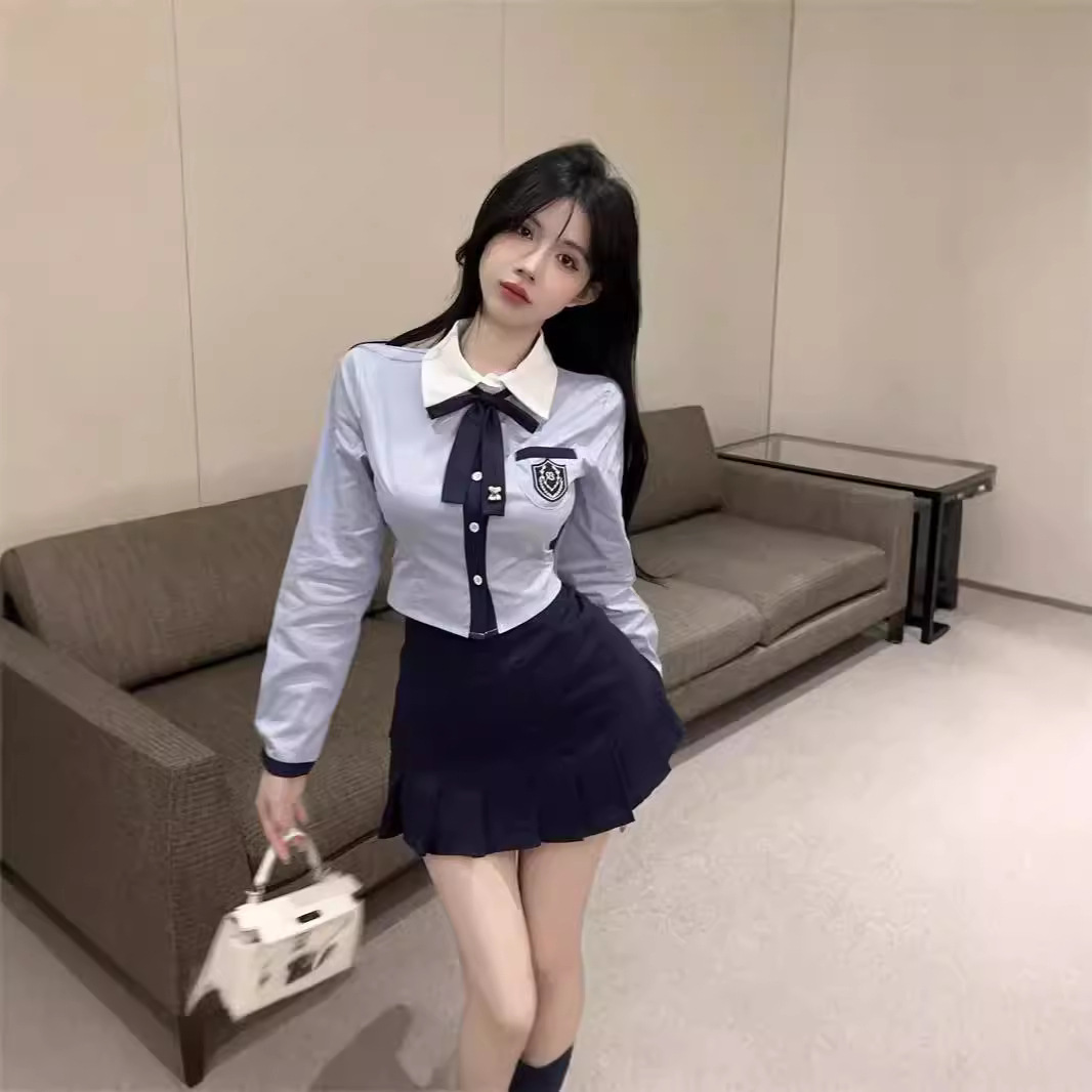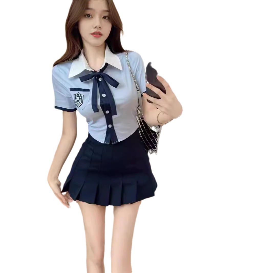 夏季新款韩系设计感短袖衬衫甜辣妹学院风制服百褶短裙两件套装女