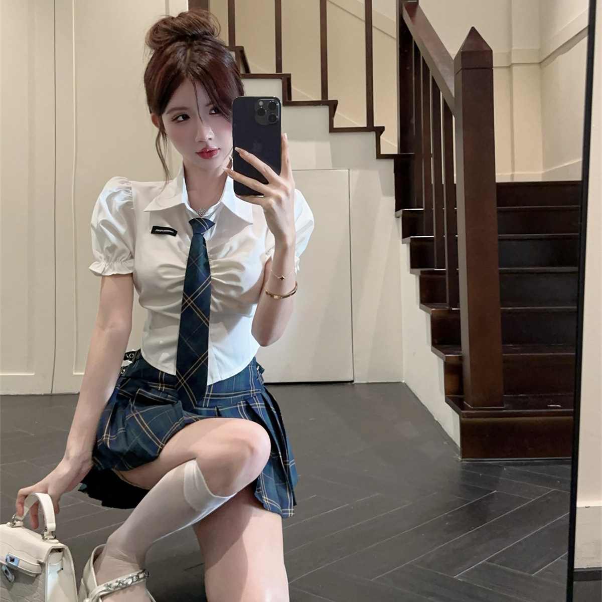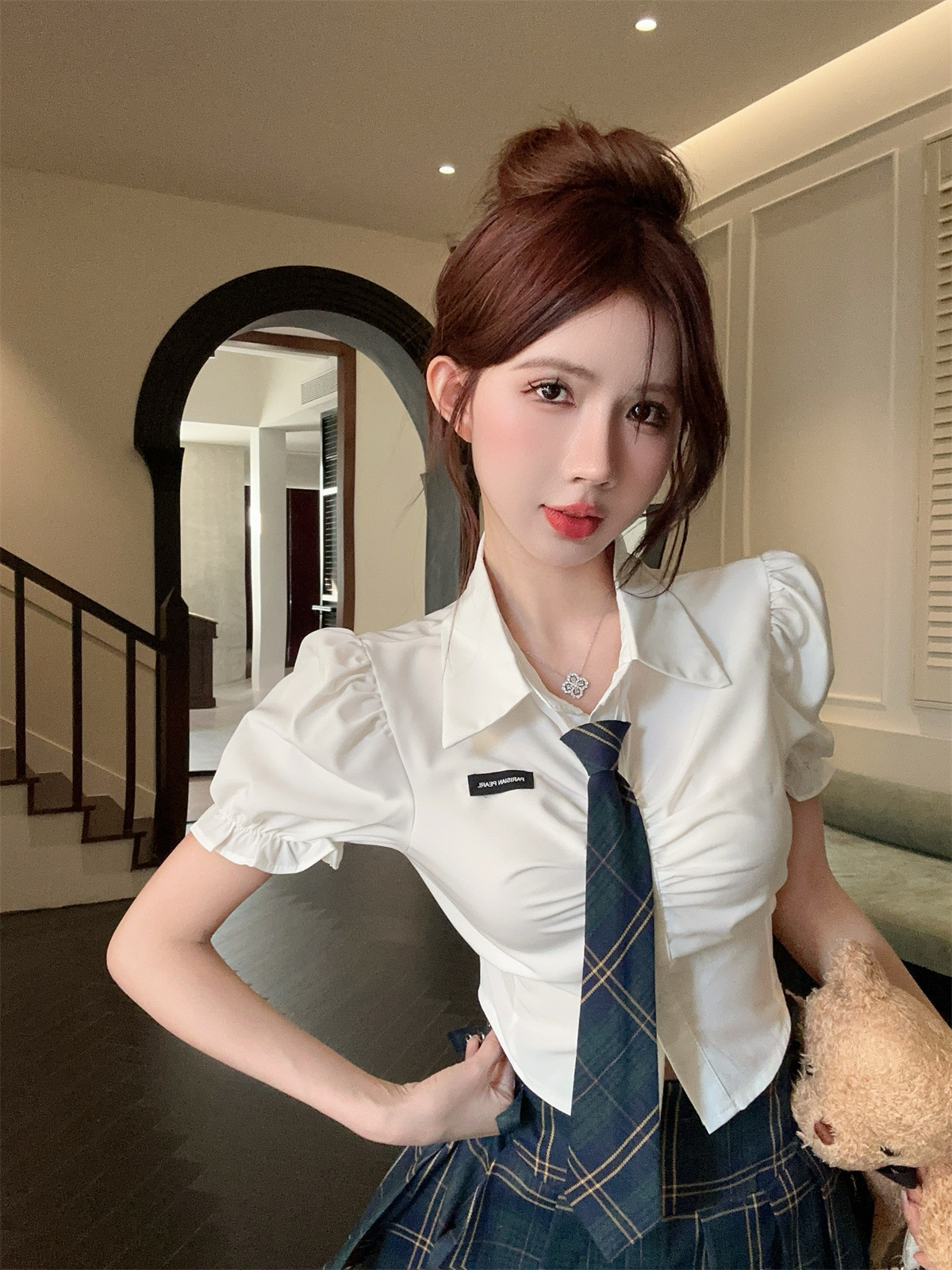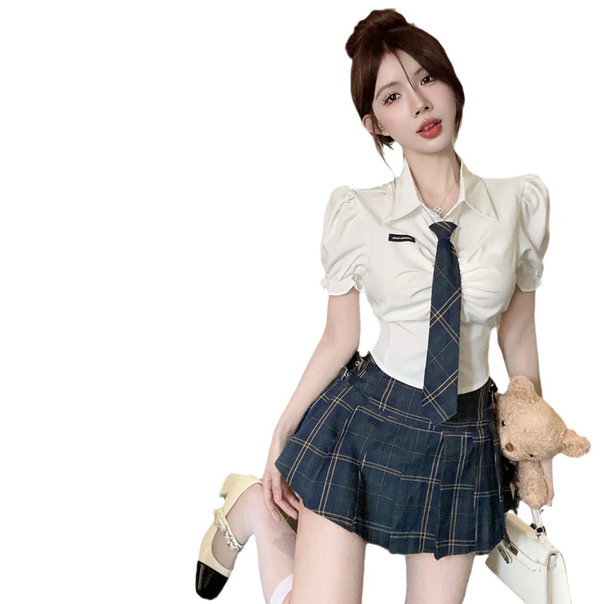 学院风jk制服泡泡袖衬衫女夏季别致法式短款小上衣高级感衬衣套装
