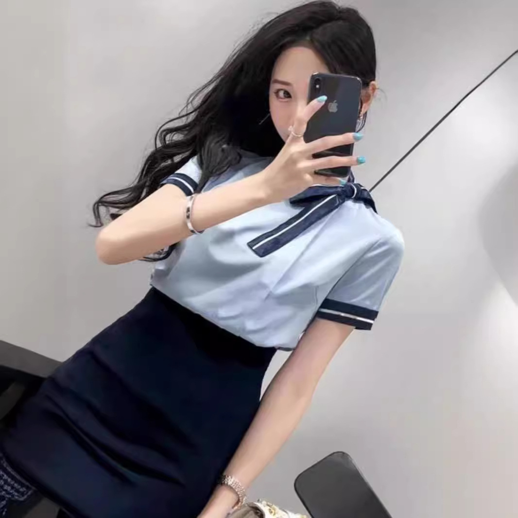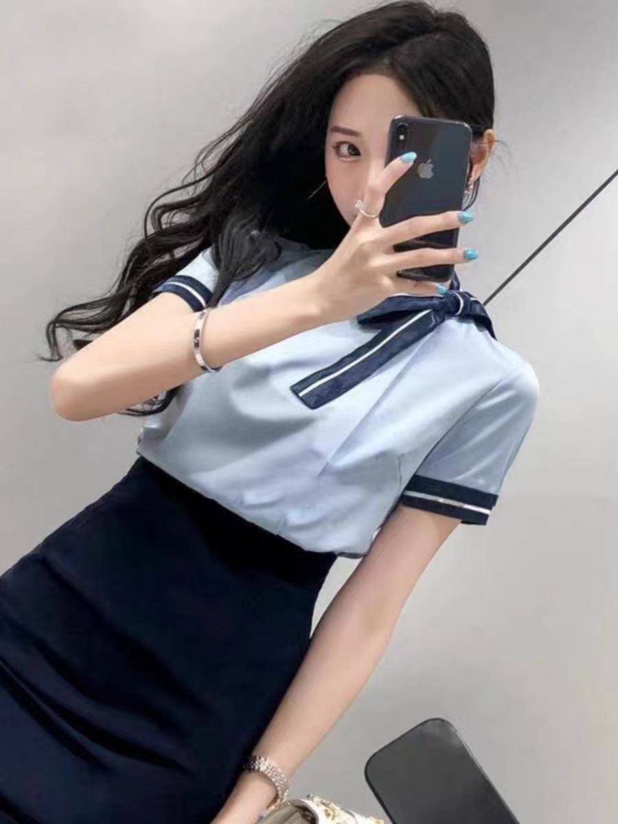 蓝色短袖上衣+黑色包臀裙