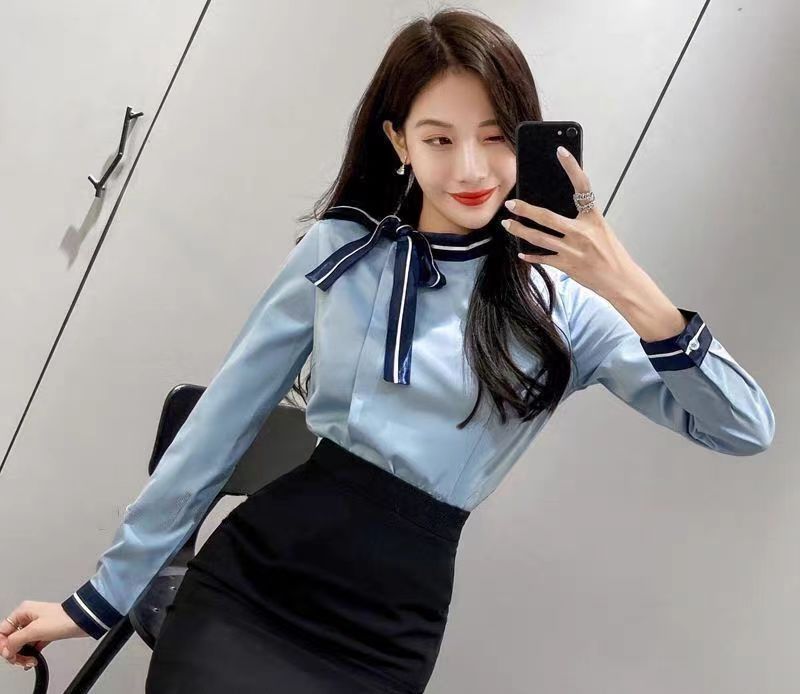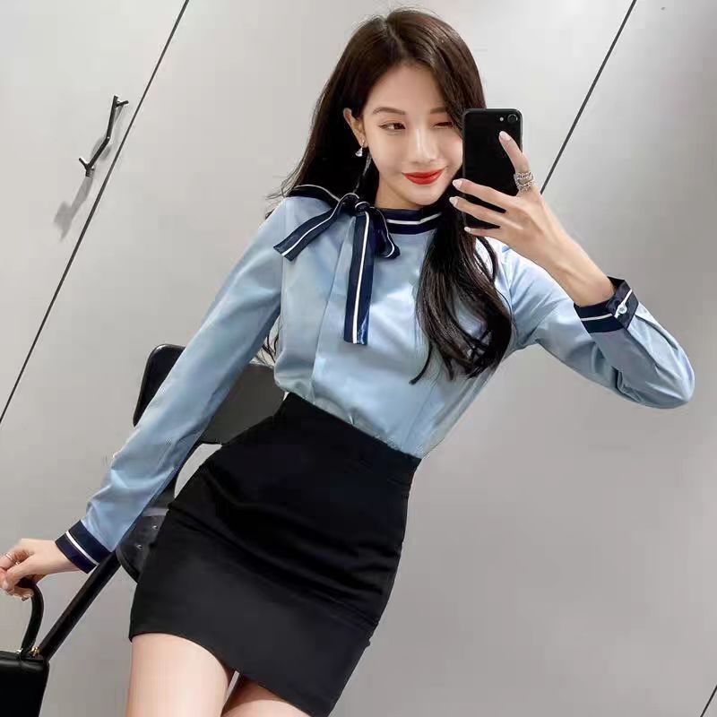 蓝色长袖上衣+黑色包臀裙