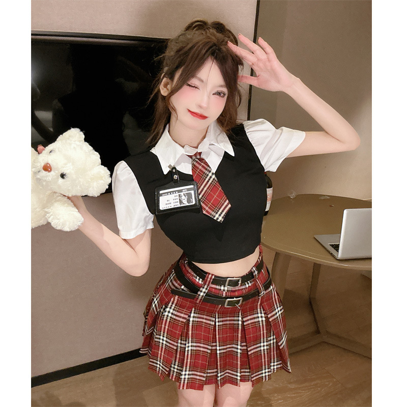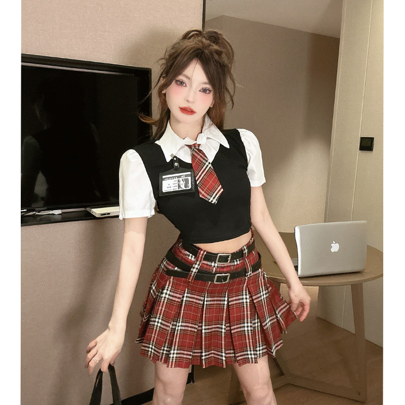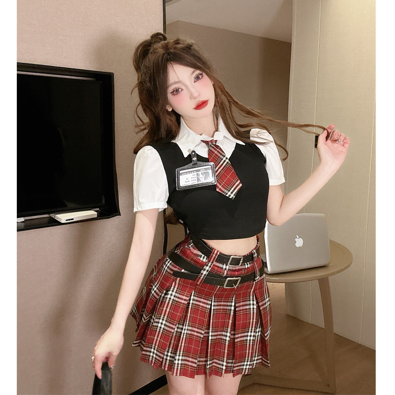 美式甜辣妹学院风套装女夏季jk制服针织假两件上衣半身裙子两件套