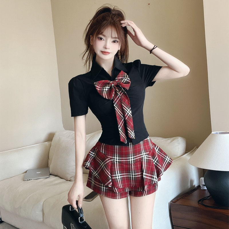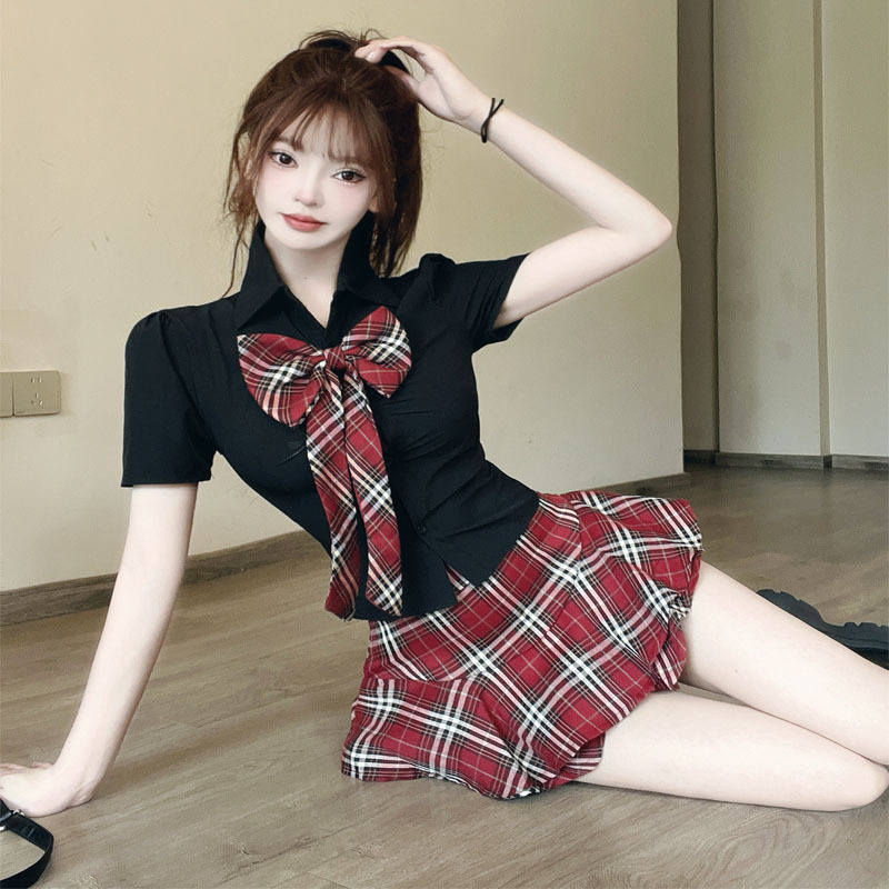 学院风辣妹jk制服套装夏季短袖蝴蝶结修身衬衫+高腰格子裙两件套