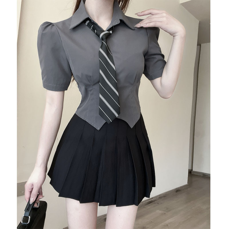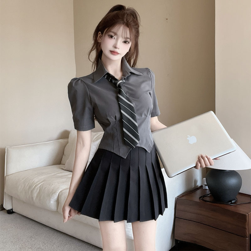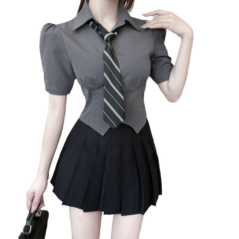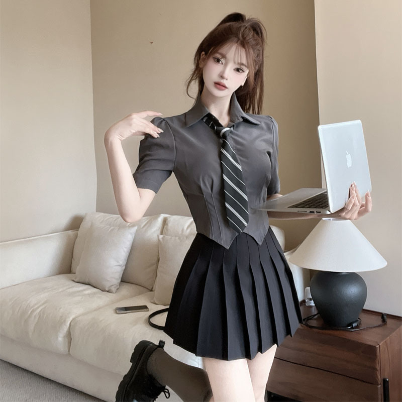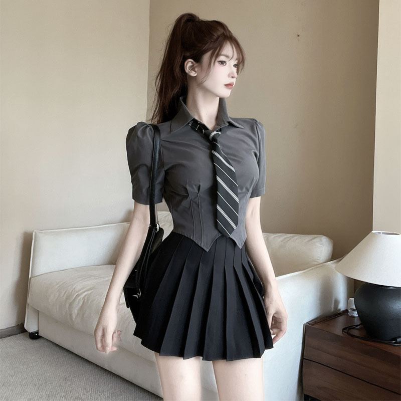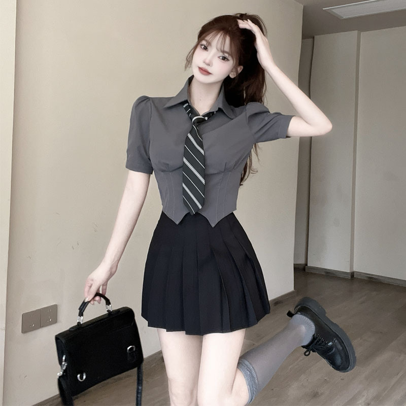 灰色上衣+黑色百褶裙