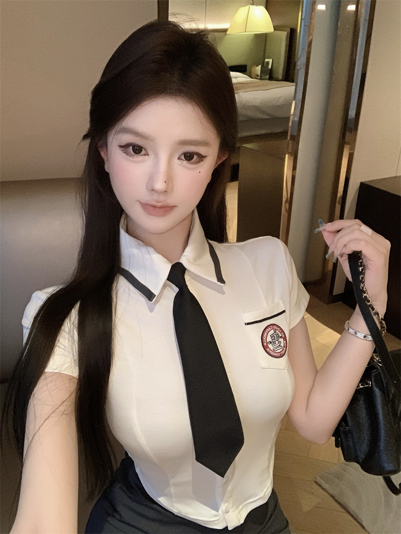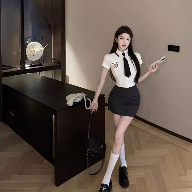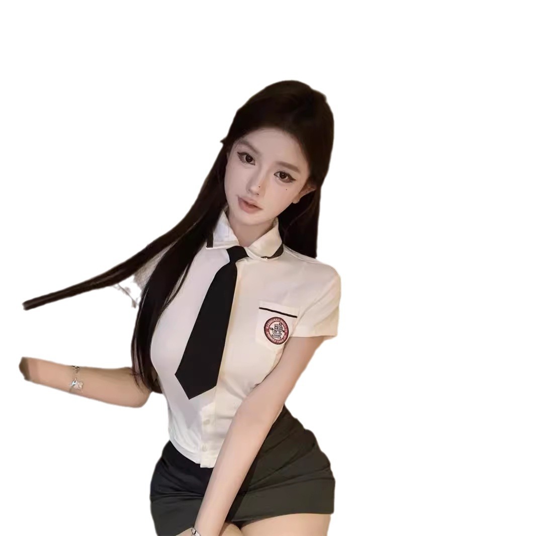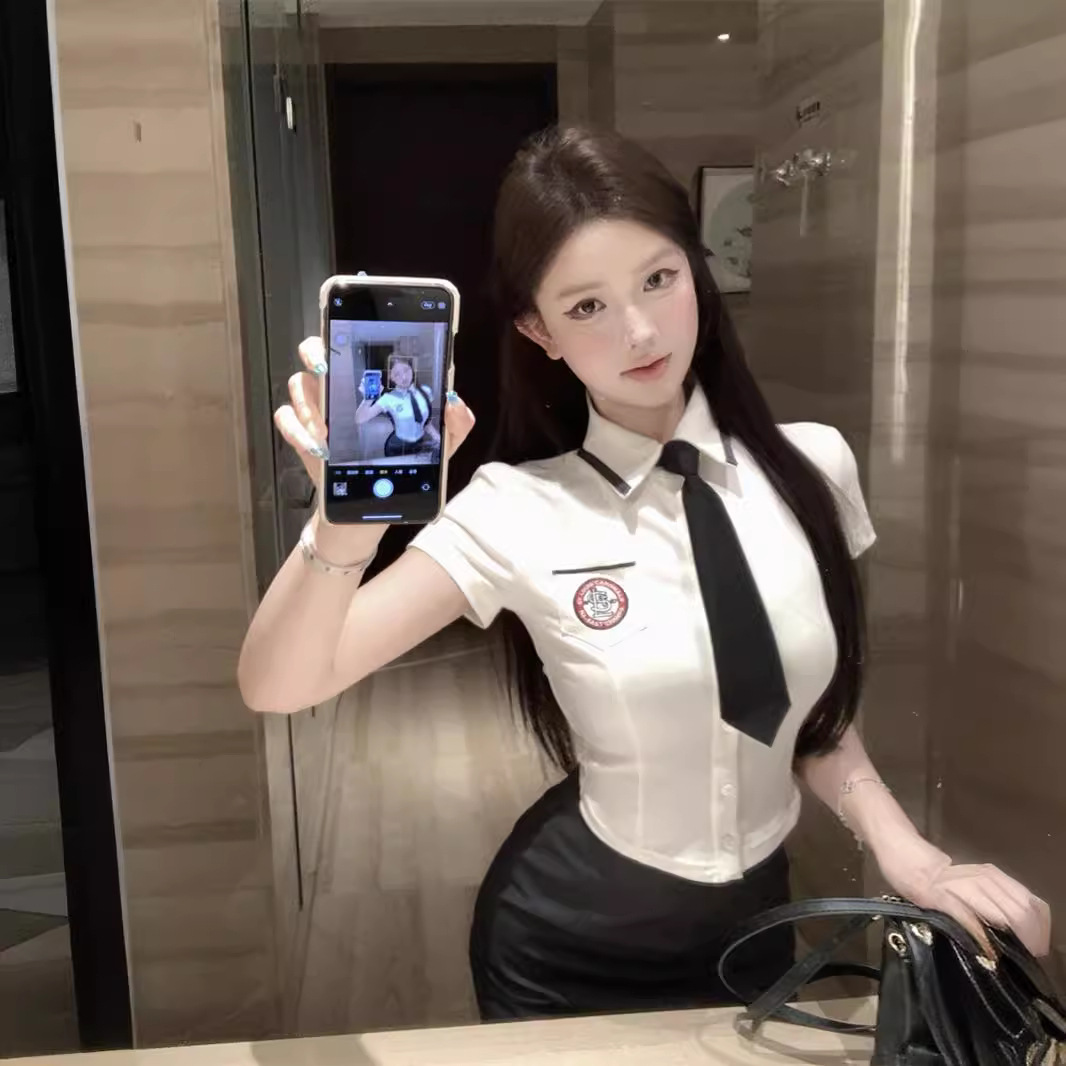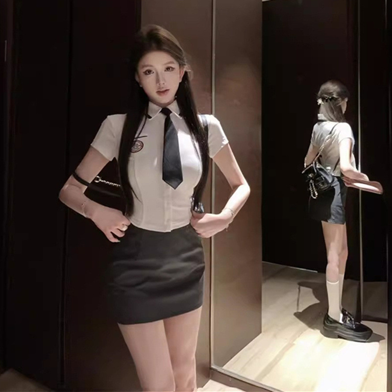 韩式校服夏季学院风收腰衬衫女白色修身短袖衬衣短裙JK制服套装潮