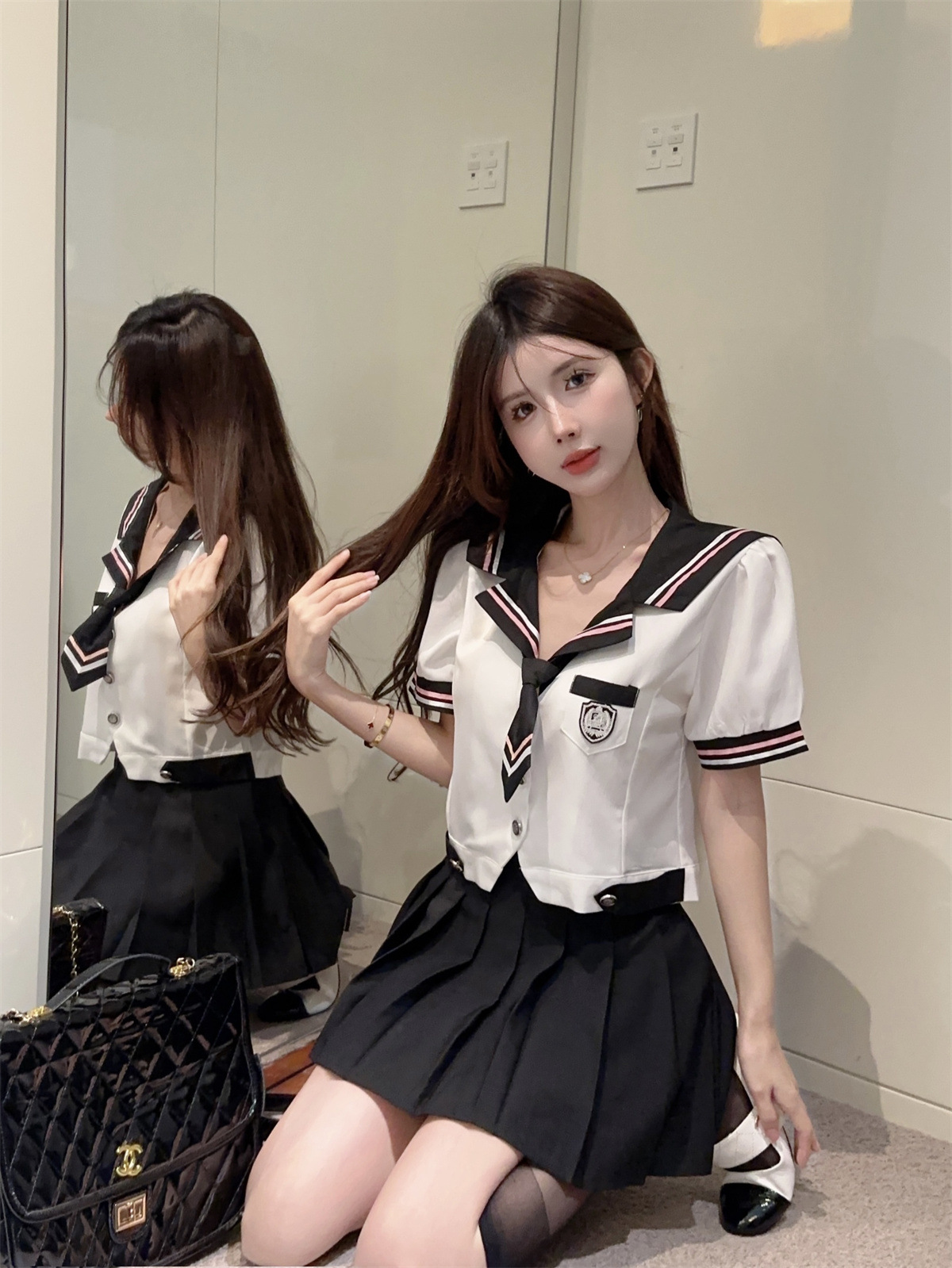 白色上衣+黑色百褶裙(送领带)