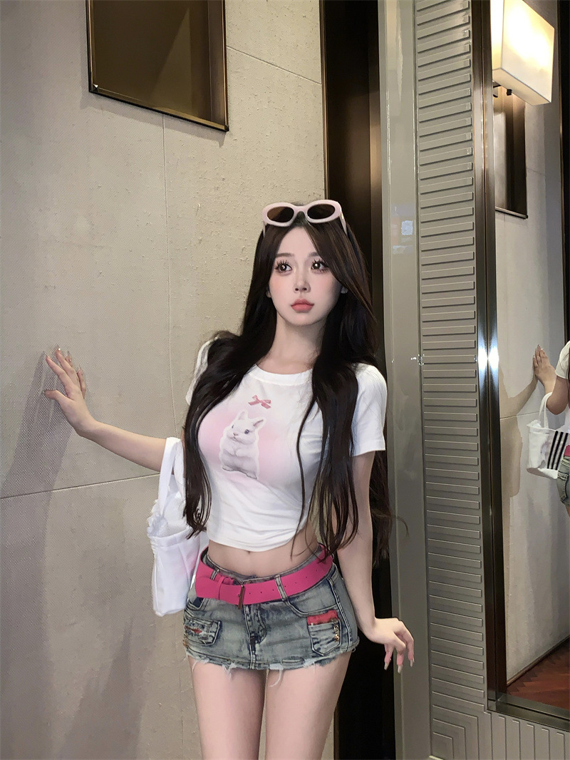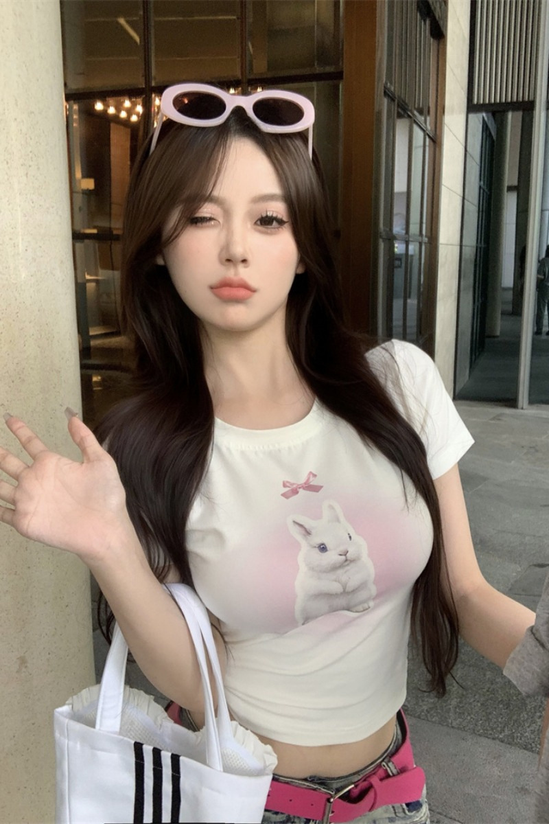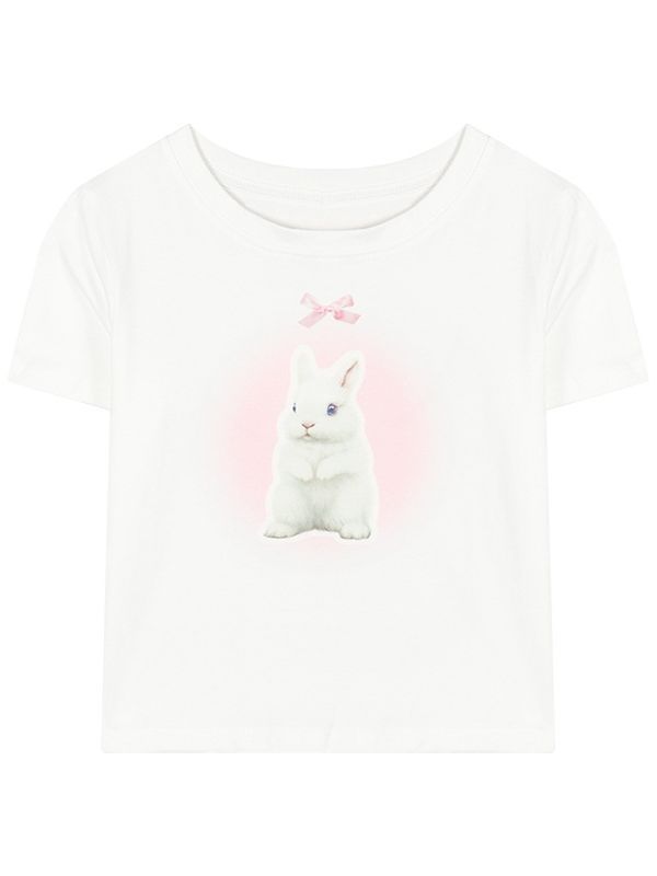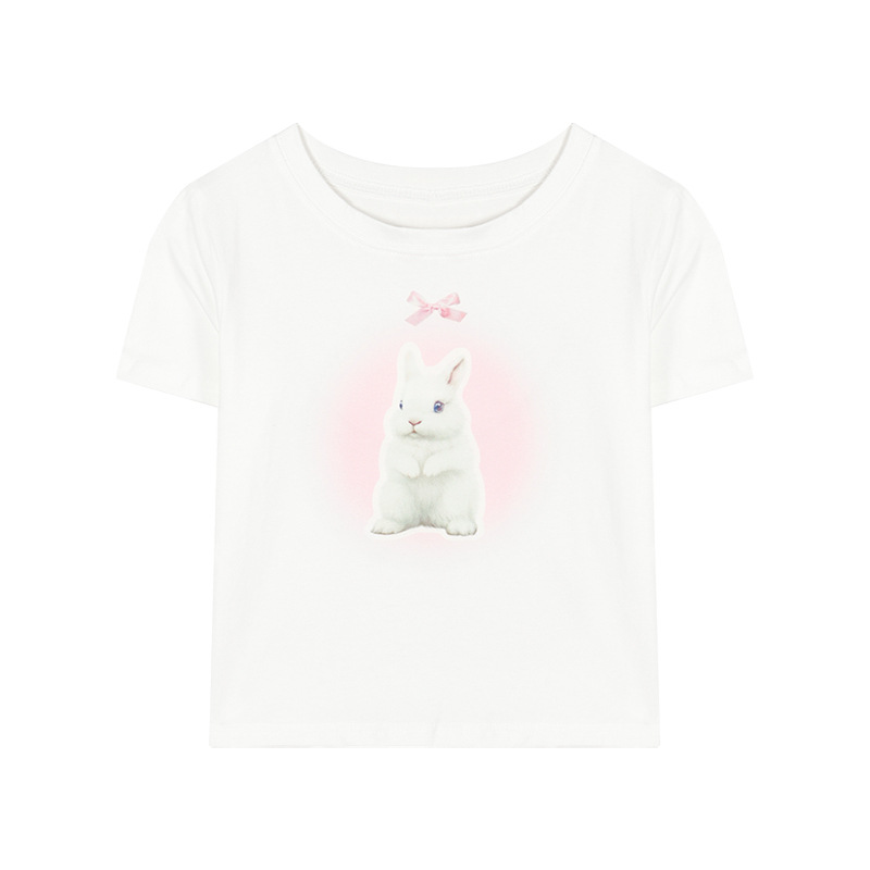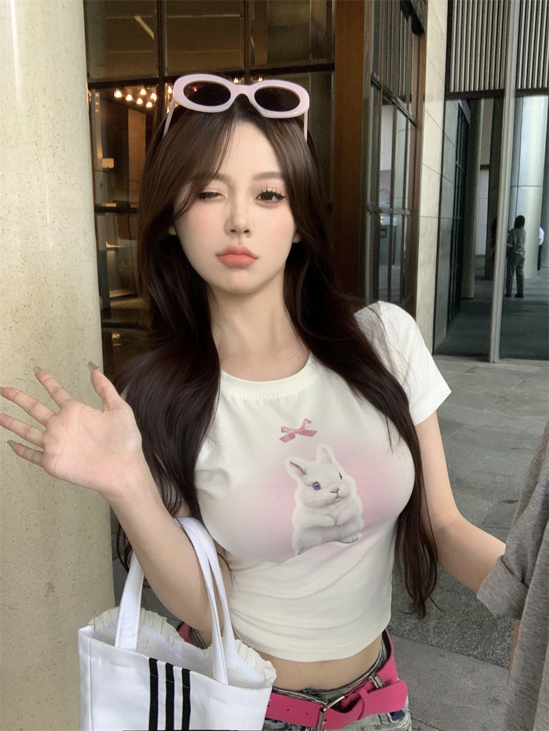 可爱兔子蝴蝶结短袖多巴胺上衣女夏季甜辣妹性感短款正肩白色T恤