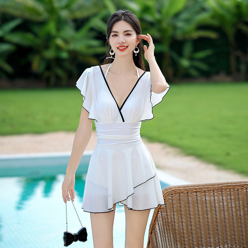 纯色V领连体泳衣女新款裙式保守遮肚高腰显瘦泡温泉泳装女